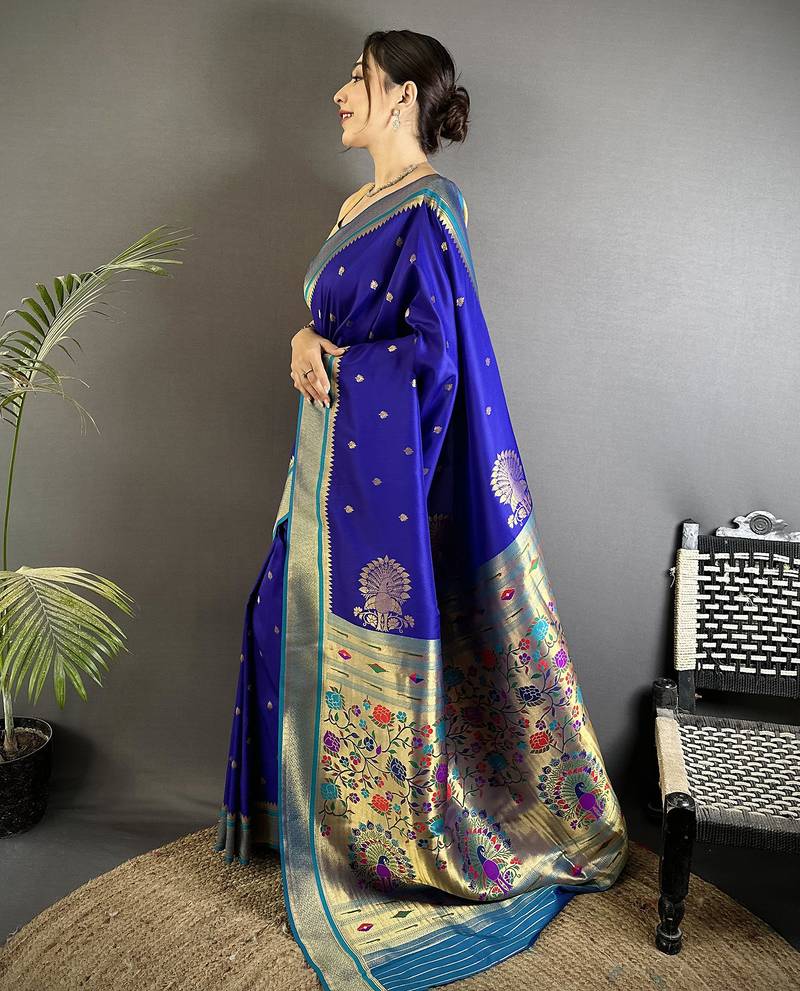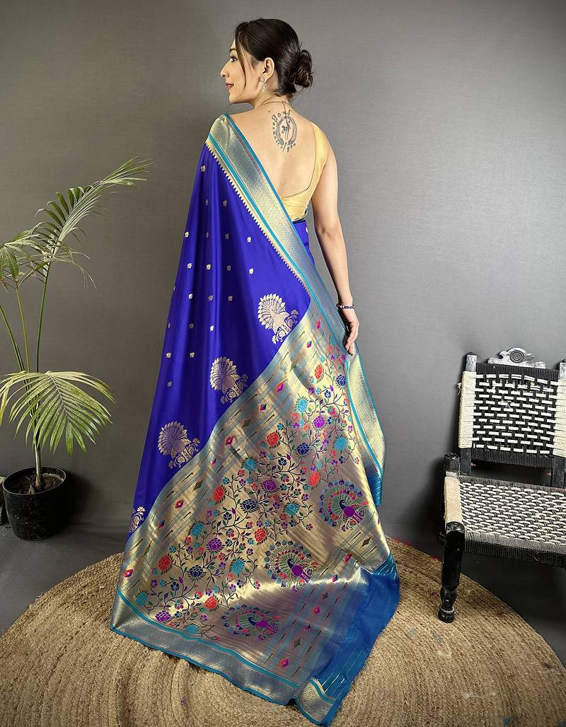 Royal blue lichi silk blend peacock & floral motifs zari weaving paithani saree