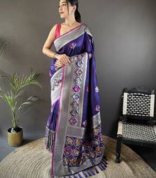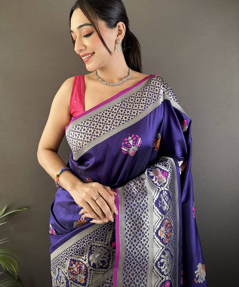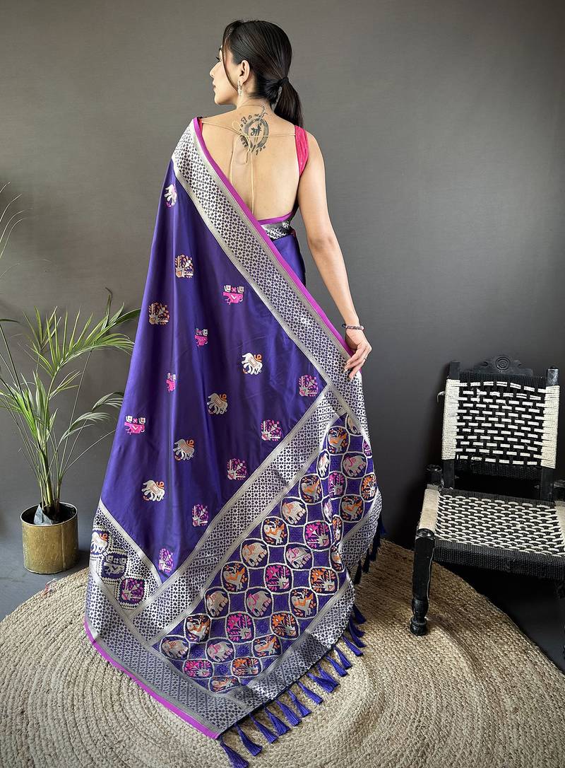 Royal blue soft lichi silk blend elephant & floral motifs minakari work banarasi saree