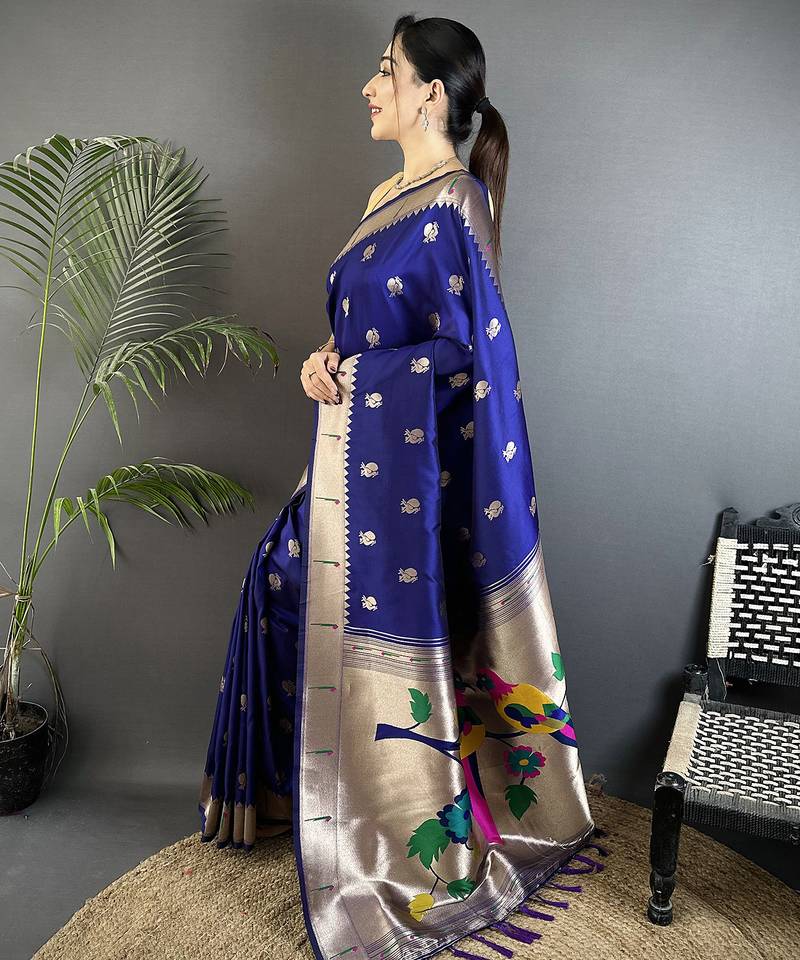 Royal blue soft silk blend peacock & floral zari motifs kanchipuram saree