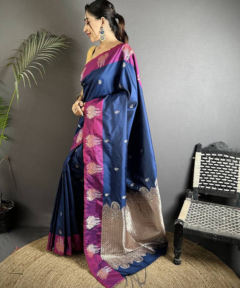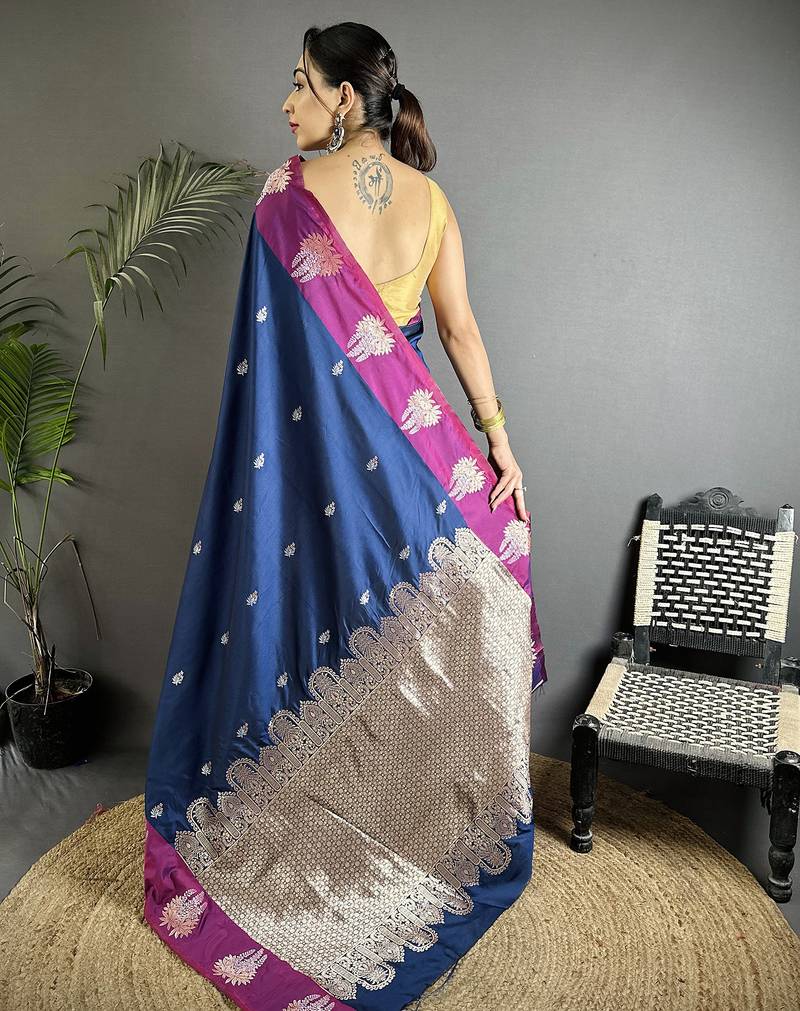 Royal blue soft silk blend small butti jacquard zari weaving banarasi saree