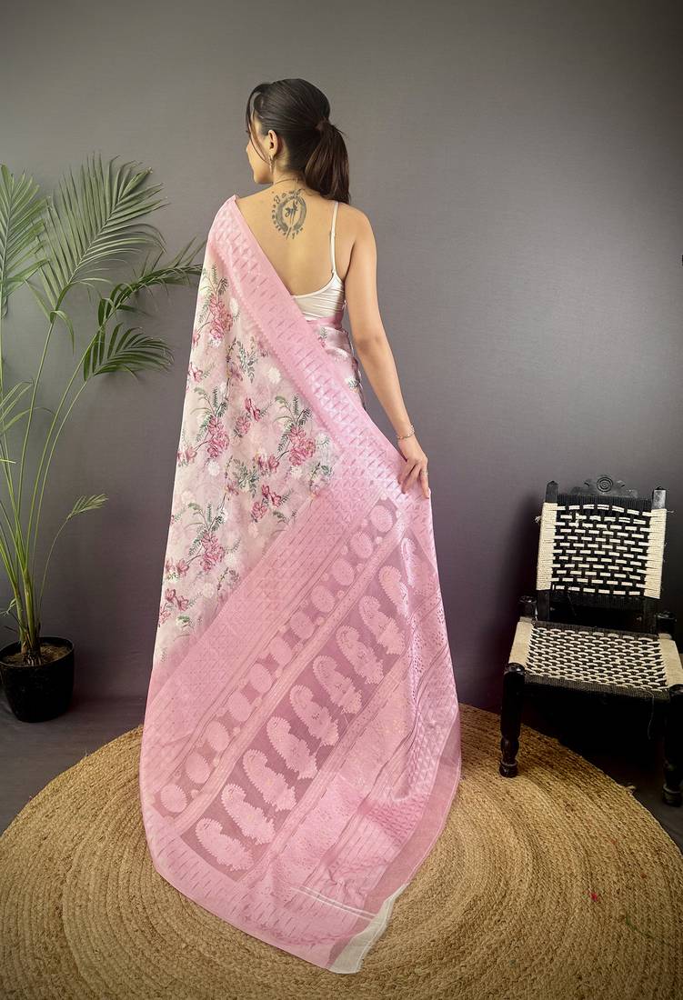 Baby pink silk blend floral motifs coppery tone banarasi saree
