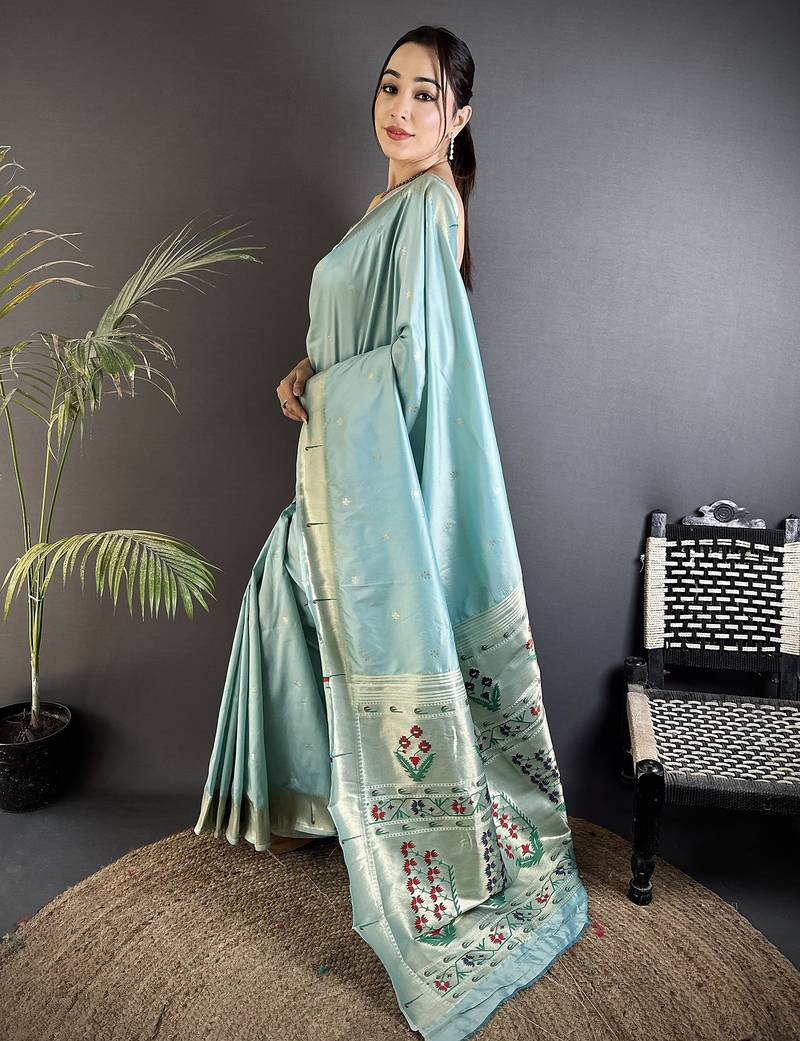 Sky blue lichi silk blend floral ikkat motifs zari weaving paithani saree