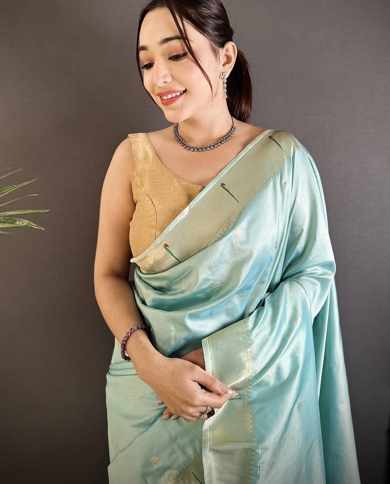 | Product Description | Bring Serene Elegance To Your Wardrobe With This Sky Blue Lichi Silk Paithani Saree, Adorned With Delicate Ikkat Motifs And Exquisite Zari Weaving. Its Soft Sky Blue Shade And Floral Designs Make It Perfect For Weddings, Festive Occasions, And Special Celebrations.