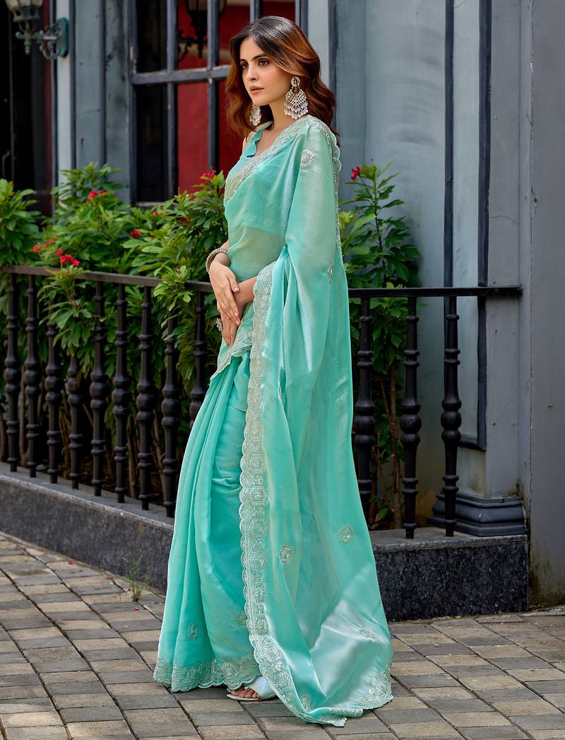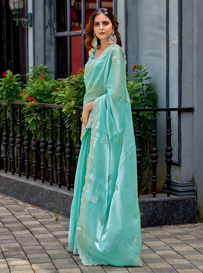 Sky blue shimmer chiffon geomatric embroidery work bollywood saree
