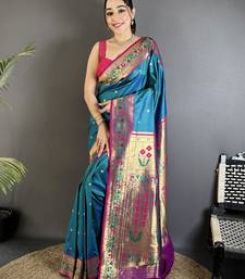 | Product Name | Teal Blue Lichi Silk Blend Ikkat Floral Motifs Zari Woven Paithani Saree | |