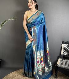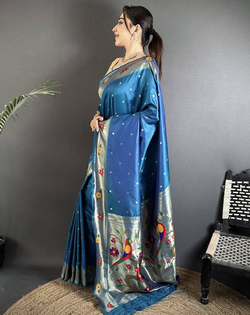 Teal blue lichi silk blend parrot & floral woven design zari weaving paithani saree