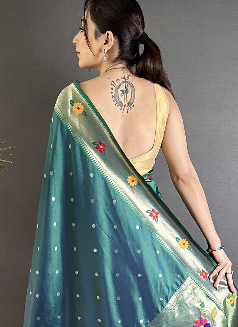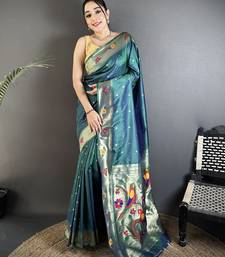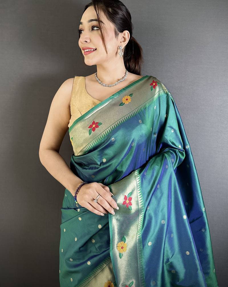 Teal lichi silk blend parrot & floral woven design zari weaving paithani saree
