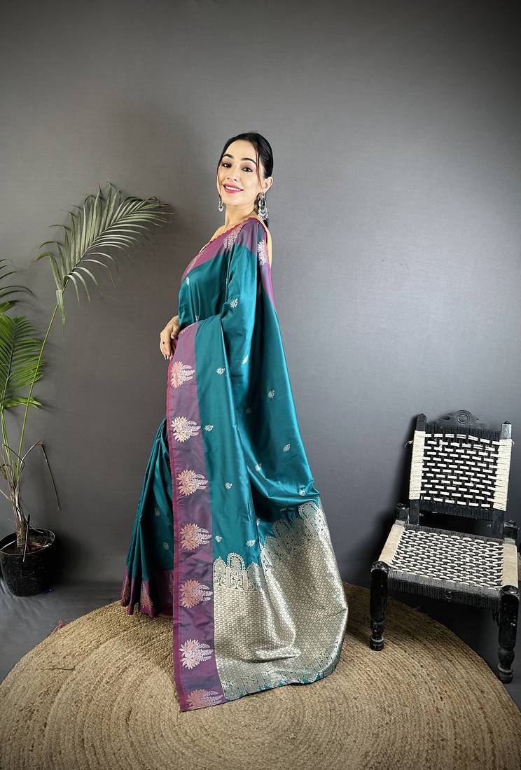 | Product Name | Teal Soft Silk Blend Small Butti Jacquard Zari Weaving Banarasi Saree | |