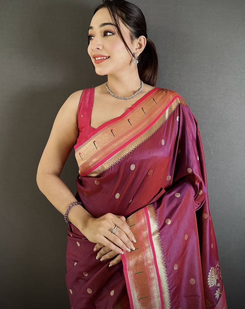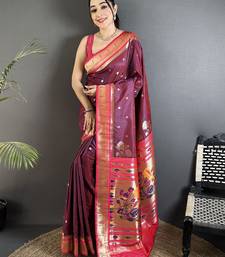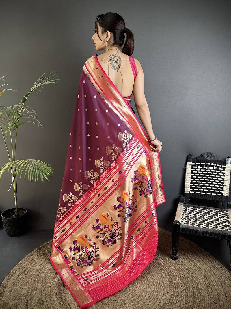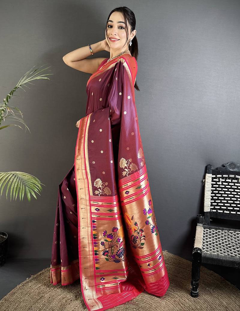 Wine lichi silk blend floral motifs zari weaving paithani saree
