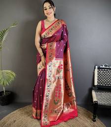 Wine lichi silk blend ikkat floral motifs zari woven paithani saree