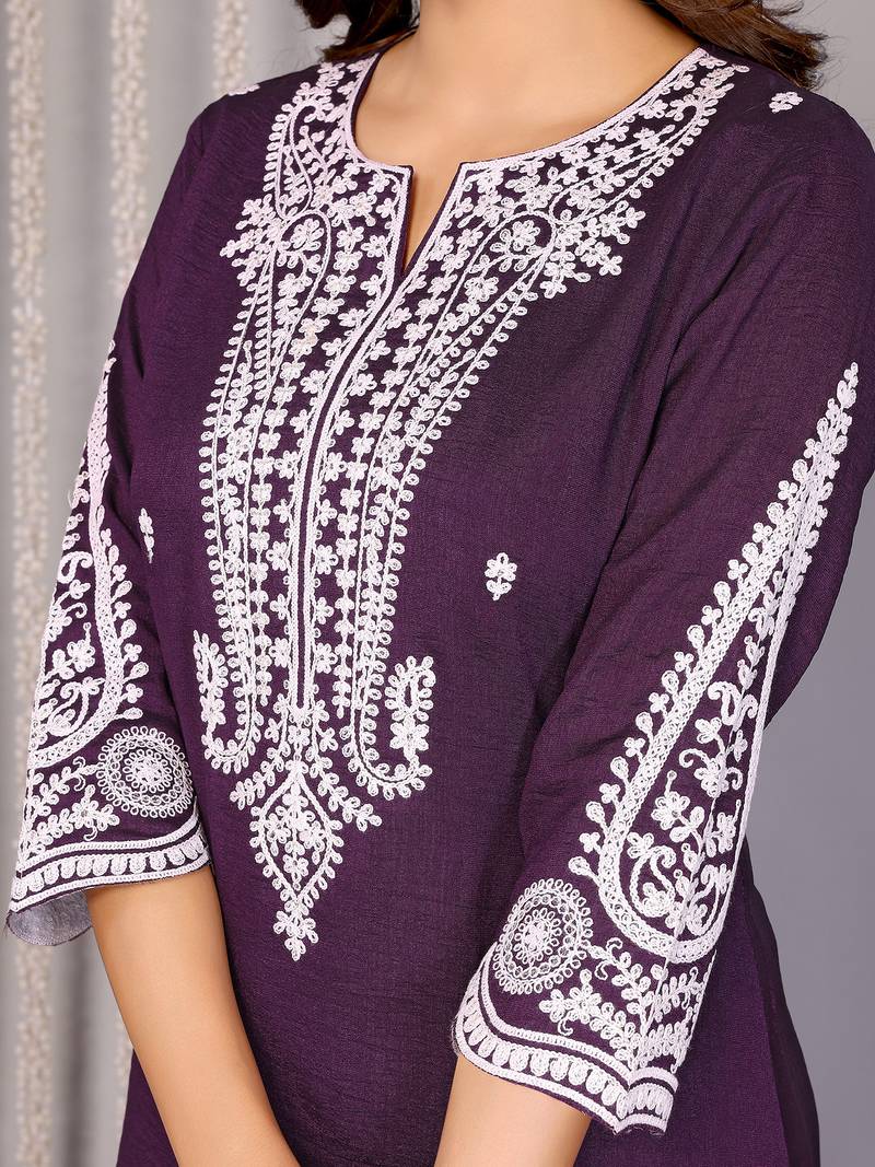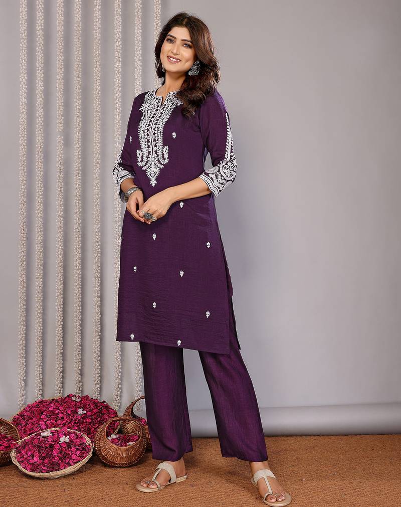 Wine vichitra silk chikankari embroidery straight neck kurta set