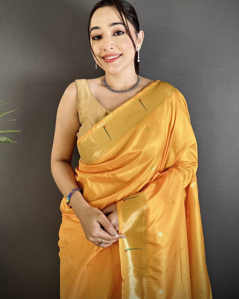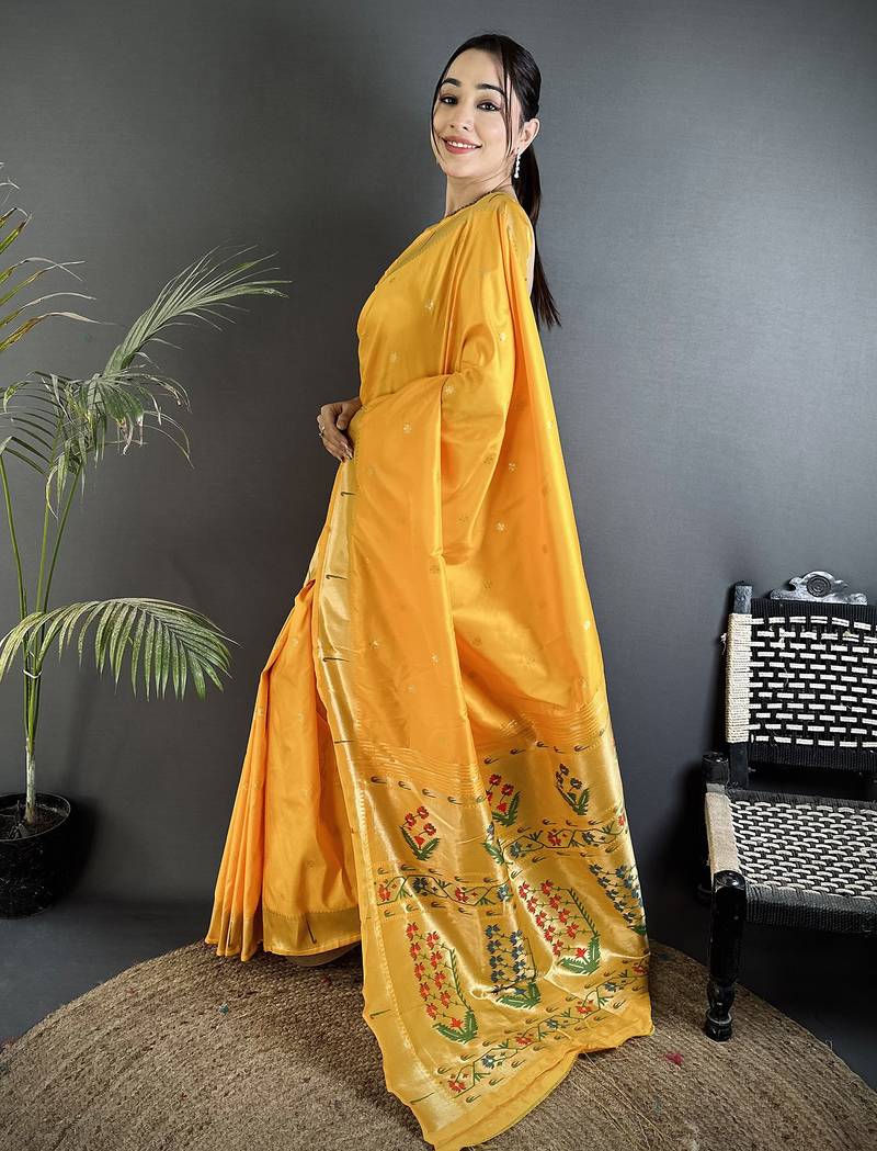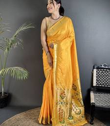 Yellow lichi silk blend floral ikkat motifs zari weaving paithani saree
