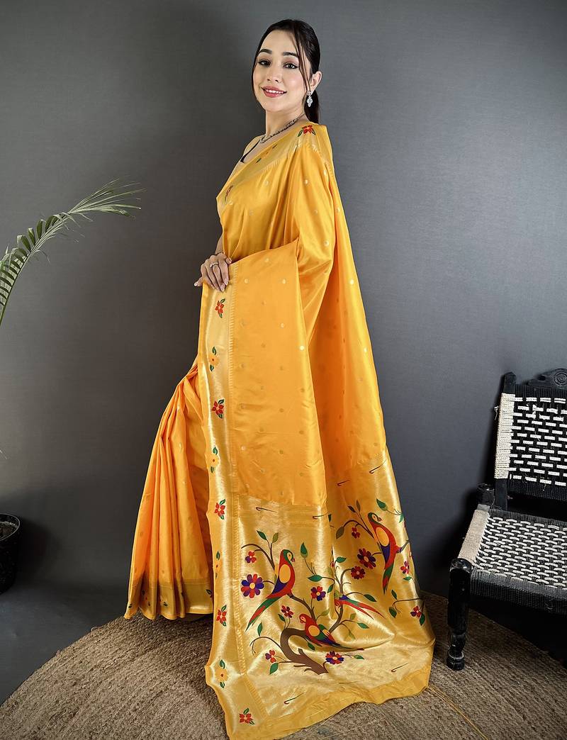 Yellow lichi silk blend parrot & floral woven design zari weaving paithani saree