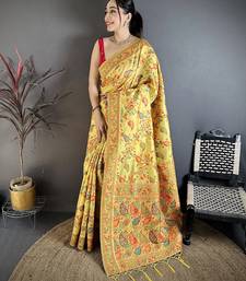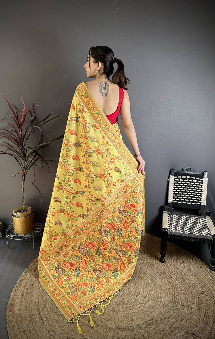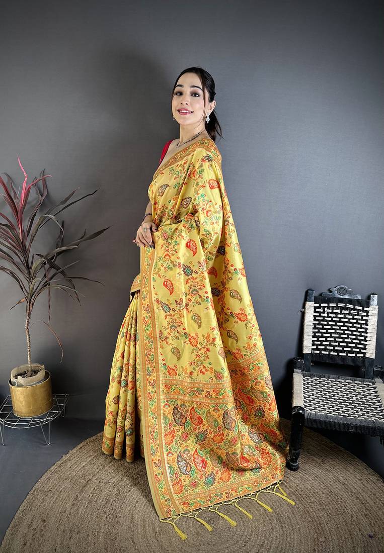 Yellow pashmina silk floral & leaf elements madhubani design kashmiri saree