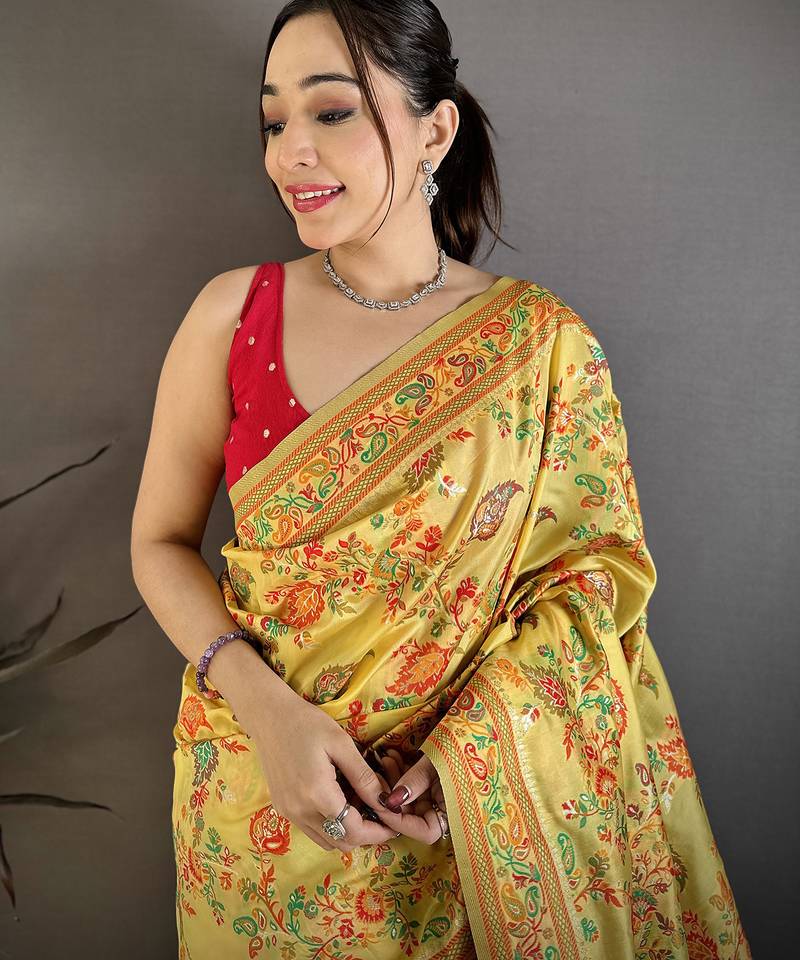 | Product Name | Yellow Pashmina Silk Floral & Leaf Elements Madhubani Design Kashmiri Saree | |