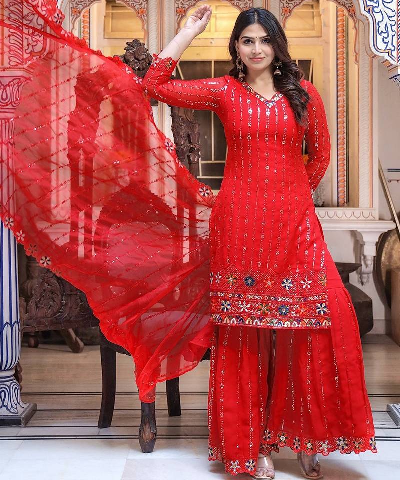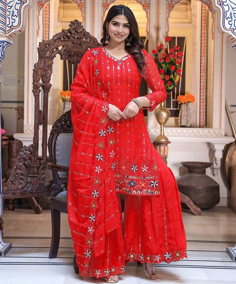 Women red sequinned embroidered georgette kurta with sharara & dupatta