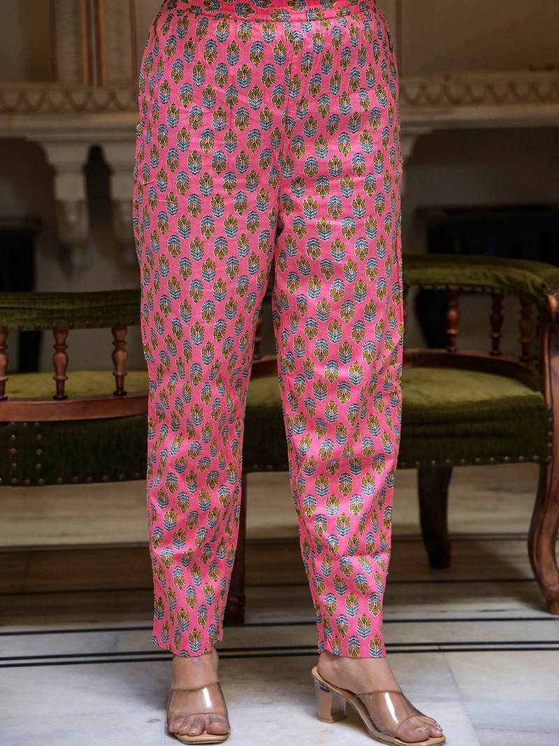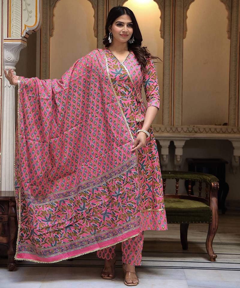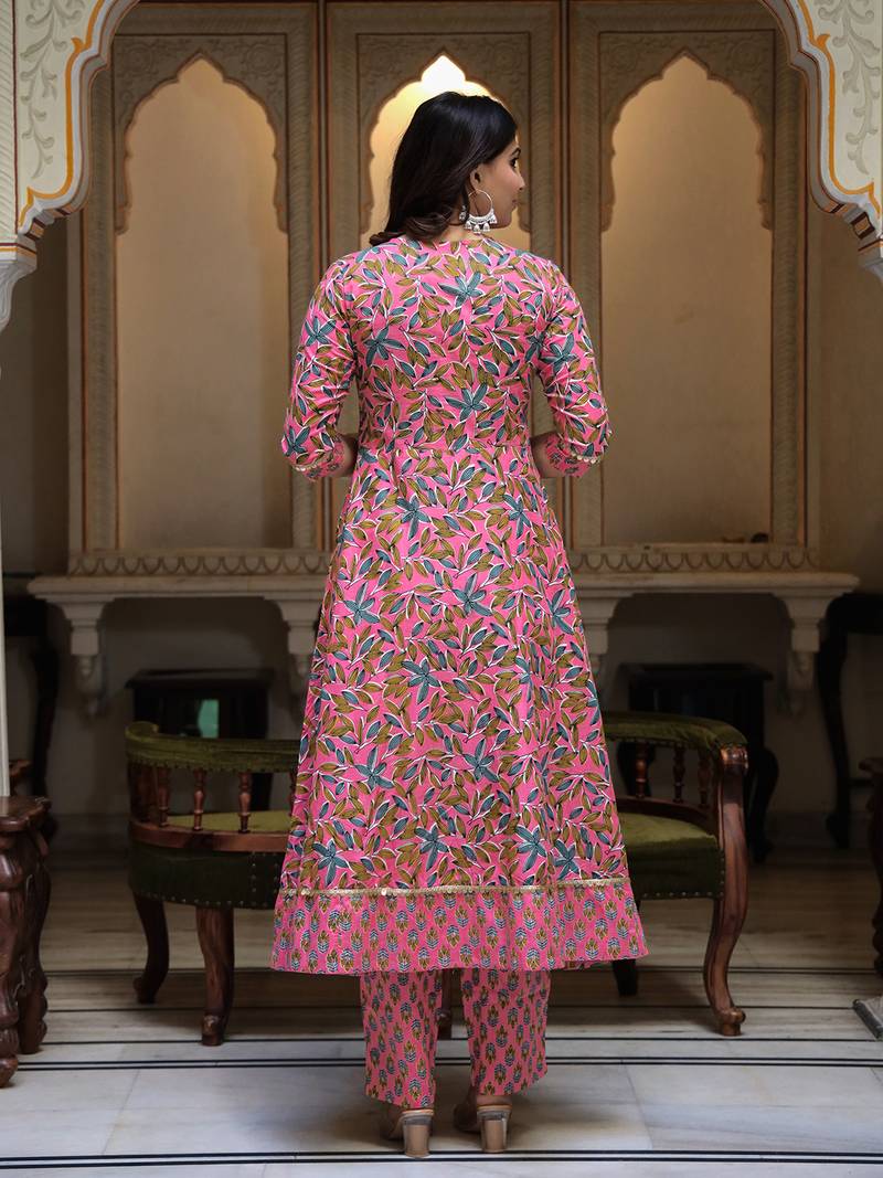 This Beautiful Ethnic Ensemble Is A Pink And Multi Color Hand Block Printed Kurta Set With Palazzo Pants And A Dupatta. It Is A Popular Style Of Traditional Indian Wear, Often Referred To As An Anarkali Suit Set, Perfect For Various Occasions From Festive Gatherings To Casual Daily Wear! Design: The Set Typically Features Exquisite Hand Block Prints In A Vibrant Floral Or Motifs Pattern, Primarily In Shades Of Pink With Green And Possibly Other Accent Colors.! Style: The Kurta (Tunic) Is Often An Anarkali Style, Which Has A Flared, Long Length (Calf To Ankle) And A Snugly Fitted Bodice. The Set Usually Includes Straight Fit Or Palazzo Style Pants And A Matching Or Complementary Dupatta (Scarf). Material: These Sets Are Commonly Made From Pure Cotton Or A Cotton Blend Fabric, Making Them Soft, Breathable, And Comfortable For All Day Wear. The Dupatta May Be Made Of Cotton Voile! Details: The Attire Can Include Details Such As A V Neck Or Round Neckline, Three Quarter Length Sleeves, And Delicate Lace Work Or Gotta Patti Embellishments.