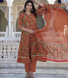 This Beautiful Ethnic Ensemble Is A Red And Multi Color Hand Block Printed Kurta Set With Palazzo Pants And A Dupatta. It Is A Popular Style Of Traditional Indian Wear, Often Referred To As An Anarkali Suit Set, Perfect For Various Occasions From Festive Gatherings To Casual Daily Wear! Design: The Set Typically Features Exquisite Hand Block Prints In A Vibrant Floral Or Motifs Pattern, Primarily In Shades Of Red With Green And Possibly Other Accent Colors.! Style: The Kurta (Tunic) Is Often An Anarkali Style, Which Has A Flared, Long Length (Calf To Ankle) And A Snugly Fitted Bodice. The Set Usually Includes Straight Fit Or Palazzo Style Pants And A Matching Or Complementary Dupatta (Scarf). Material: These Sets Are Commonly Made From Pure Cotton Or A Cotton Blend Fabric, Making Them Soft, Breathable, And Comfortable For All Day Wear. The Dupatta May Be Made Of Cotton Voile! Details: The Attire Can Include Details Such As A V Neck Or Round Neckline, Three Quarter Length Sleeves, And Delicate Lace Work Or Gotta Patti Embellishments.