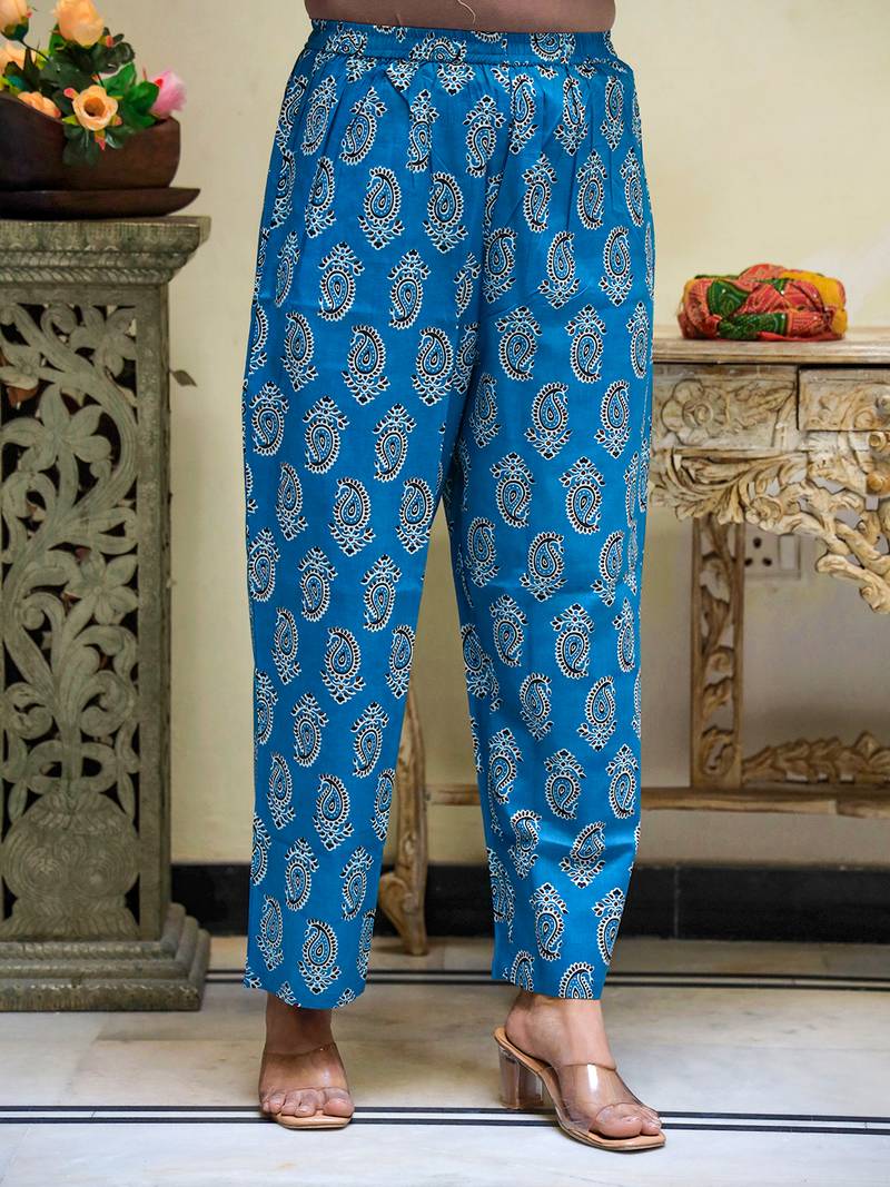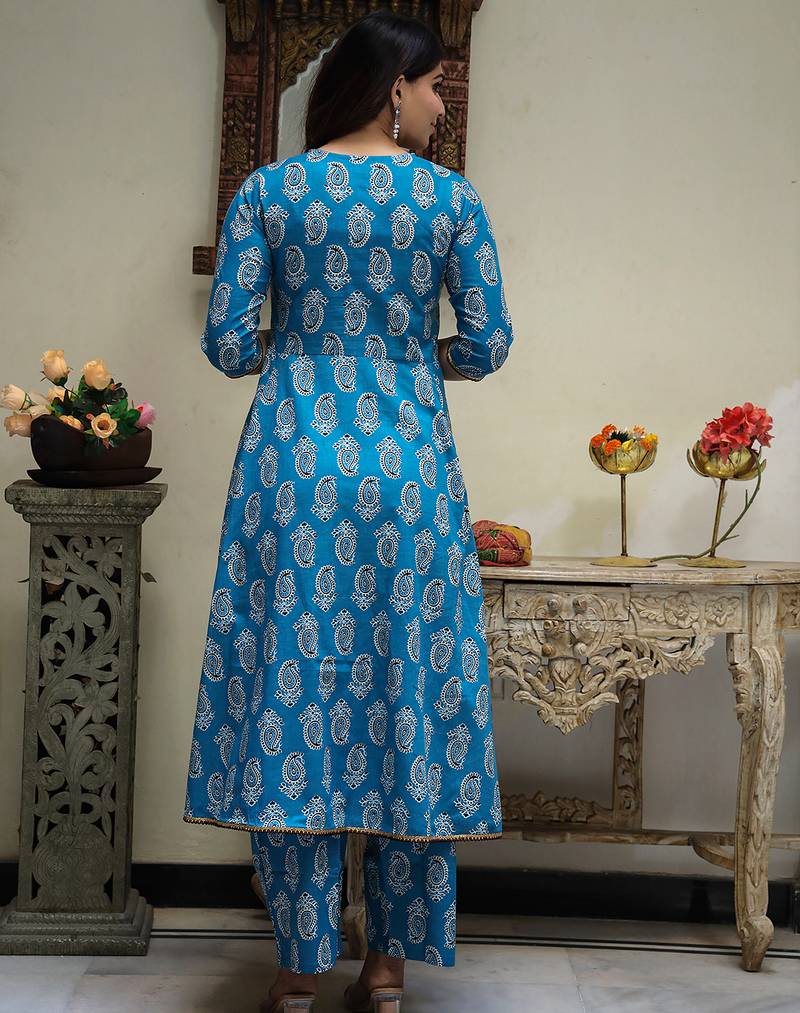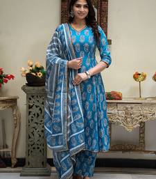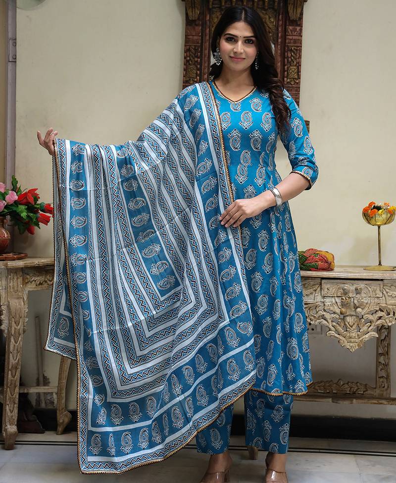 This Traditional Indian Outfit Is A Blue And Pink Floral Printed Anarkali Kurta Set With A Dupatta. ! Product Description ! Design: The Set Features An Anarkali Style Kurta (A Long, Flared Top) With A Panelled Design That Reaches Calf Length. The Kurta And Accompanying Palazzo Are Adorned With An All Over Blue And White Floral And Ethnic Motif Print. The Set Includes A Contrasting, Vibrant Hot Pink Dupatta.! Details: The Kurta Has A Round Neckline And Three Quarter Regular Sleeves. The Garment Often Features Details Like Thread Work Or Gota Work.! Material: The Fabric Is Commonly Pure Cotton, Noted For Being Soft, Breathable, And Comfortable For All Day Wear! Occasion: This Style Is Versatile And Is Often Recommended For Casual Wear, Festive Gatherings, Or Day Ceremonies.