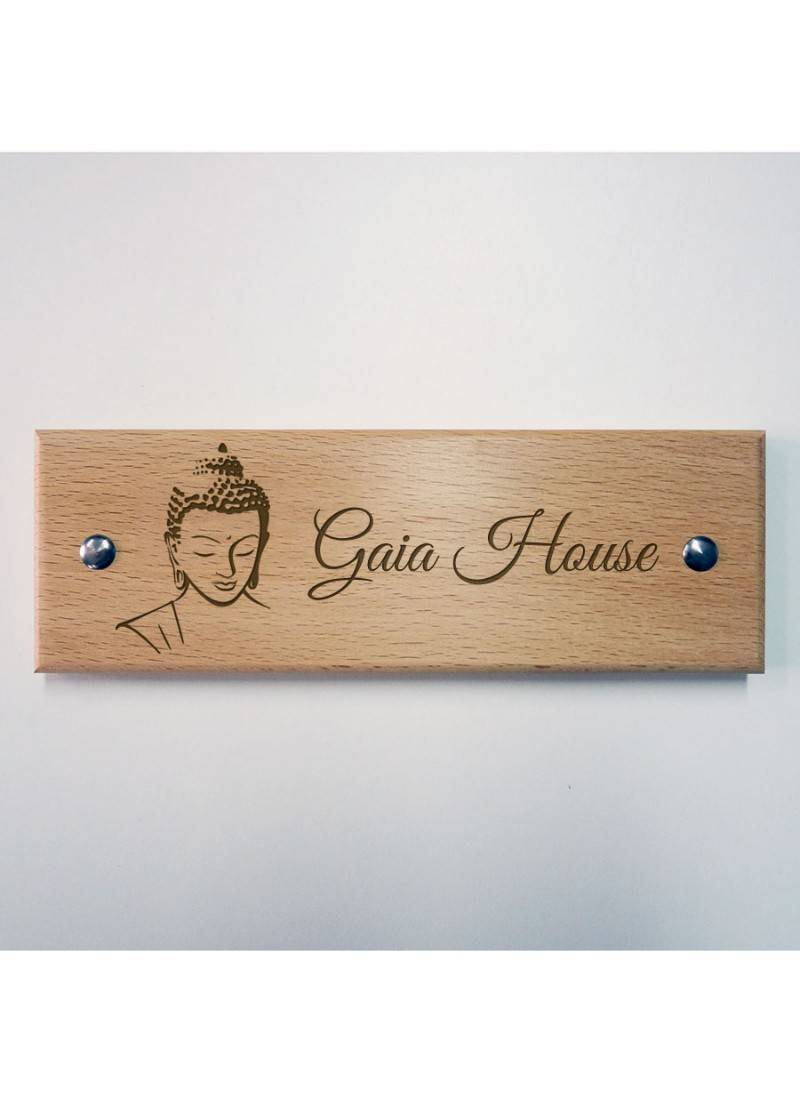 Personalised buddha wooden name plate by engrave
