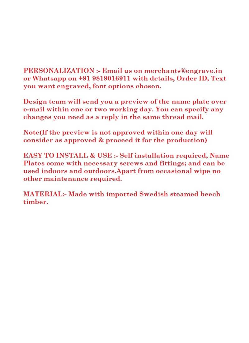 | Product Description | And Can Be Used Indoors And Outdoors.Apart From Occasional Wipe No Other Maintenance Required.Material: Made With Imported Swedish Steamed Beech Timber.Personalization : Email Us On Merchants@Engrave.In Or Whatsapp On +91 9819016911 With Details, Order Id, Text You Want Engraved, Font Options Chosen. Design Team Will Send You A Preview Of The Name Plate Over E Mail Within One Or Two Working Day. You Can Specify Any Changes You Need As A Reply In The Same Thread Mail. Note(If The Preview Is Not Approved Within One Day Will Consider As Approved & Proceed It For The Production) |
