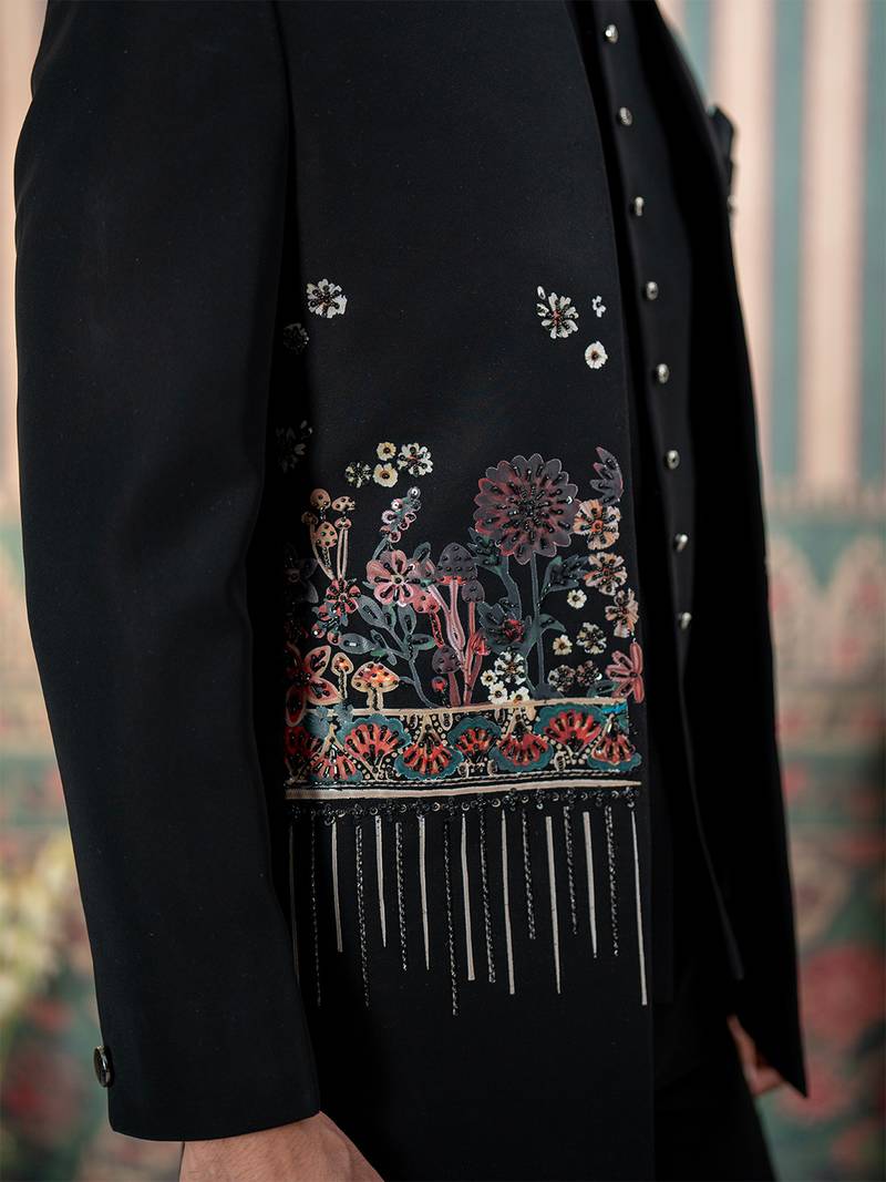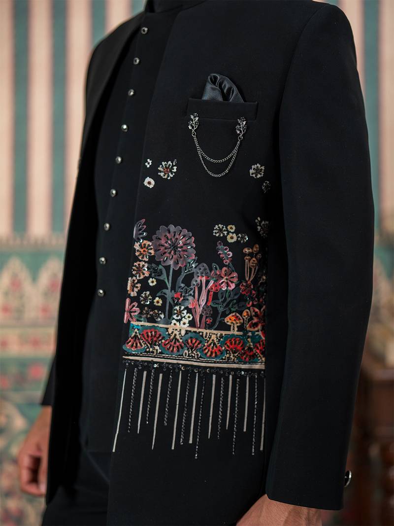 | Product Name | Black Jodhpuri Suit With Floral Rubber Print And Hand Embroidery | |