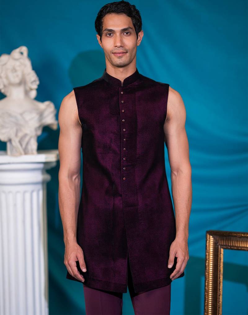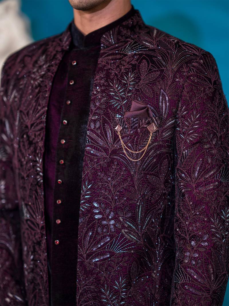 | Product Description | Luxurious Maroon Velvet Indowestern, Richly Embellished With Sequins And Intricate Floral Thread Work. Perfect For Sangeet, Weddings, Receptions, And Festive Occasions For A Regal Ethnic Appearance. |
