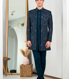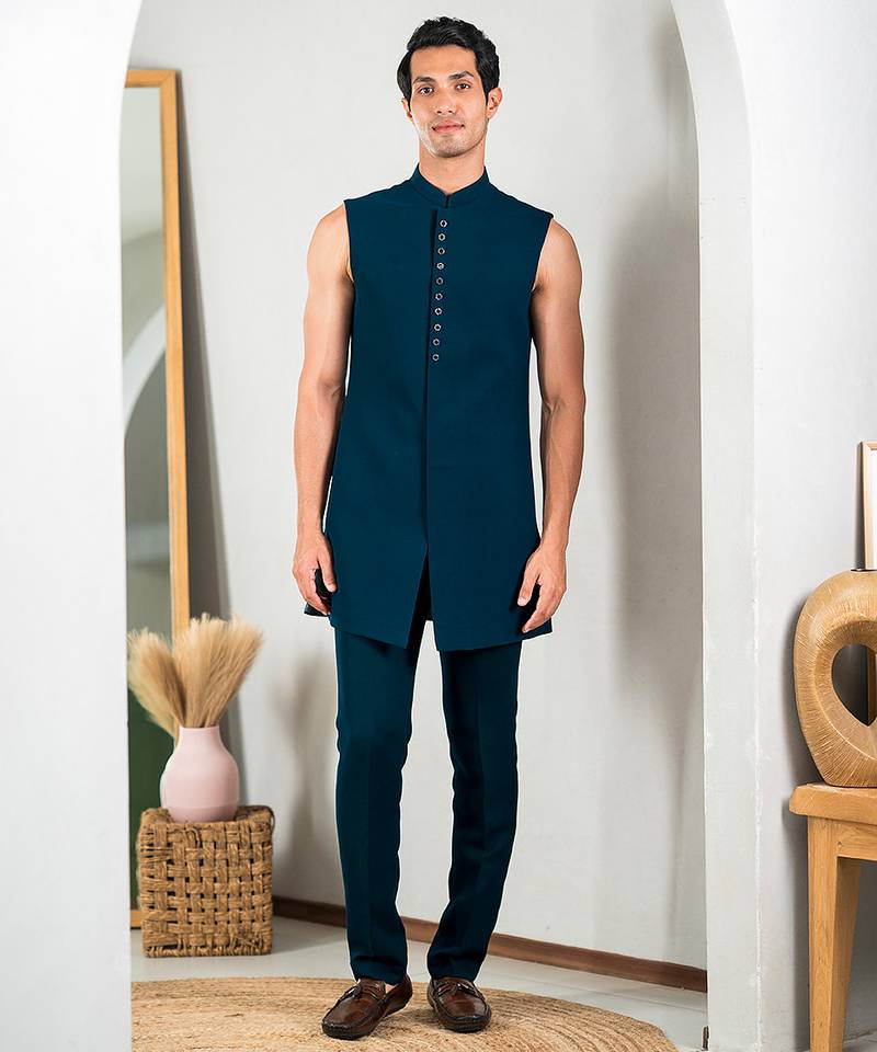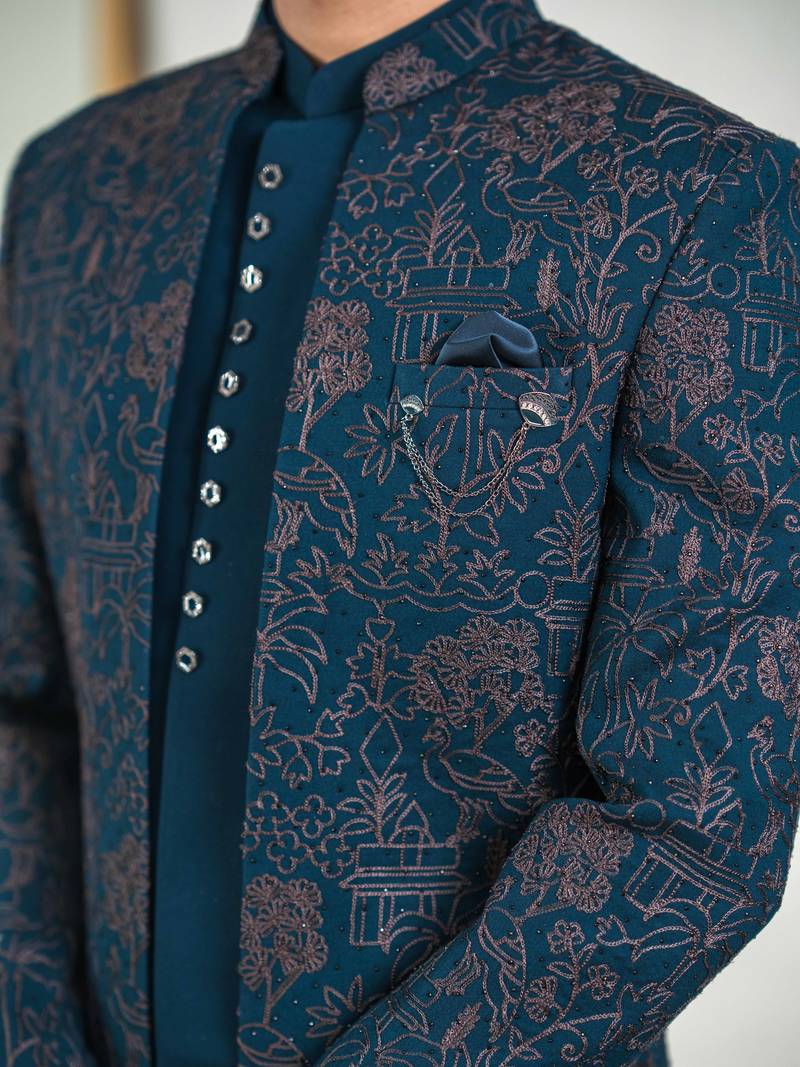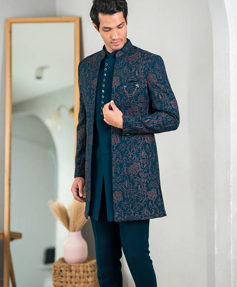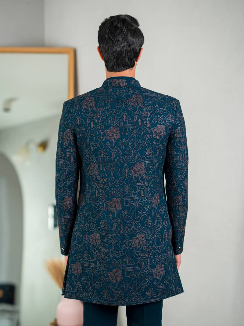 Peacock green indowestern with tranquil nature detailing thread and stone work