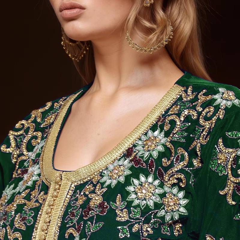 | Product Description | Luxury Dark Green Color Full Sleeves Moroccan Kaftan, This Luxurious Design That's Sure To Turn Heads, This Kaftan Dress Flows Over Curves And Boasts An Ornate Embellished Design With Golden & Silver Beads, And Beautiful Crystal Stones. |