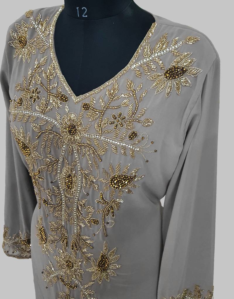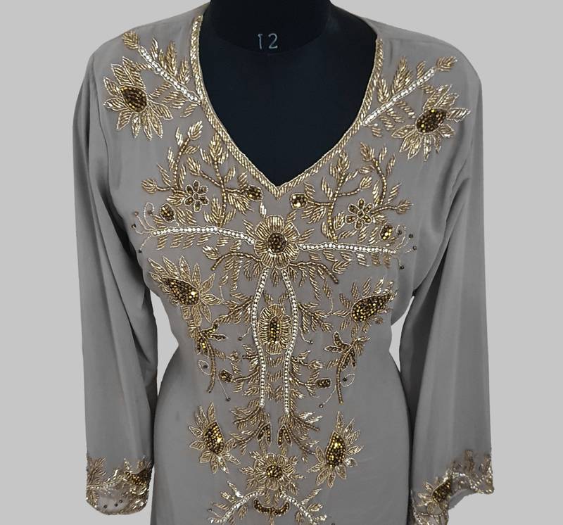 | Product Description | Luxury Grey Color Full Sleeves Moroccan Kaftan, This Luxurious Design That's Sure To Turn Heads, This Kaftan Dress Flows Over Curves And Boasts An Ornate Embellished Design With Golden & Beads, And Beautiful Crystal Stones. |