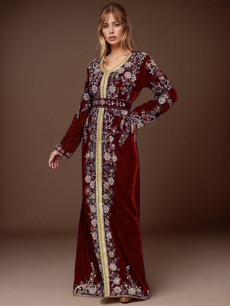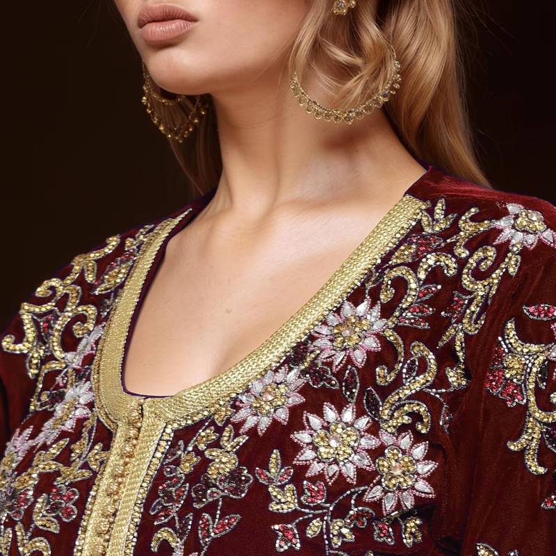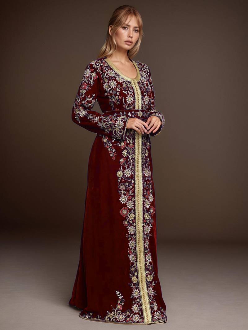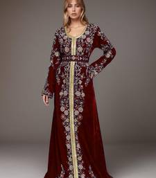 | Product Description | Luxury Maroon Color Full Sleeves Moroccan Kaftan, This Luxurious Design That's Sure To Turn Heads, This Kaftan Dress Flows Over Curves And Boasts An Ornate Embellished Design With Golden & Silver Beads, And Beautiful Crystal Stones. |