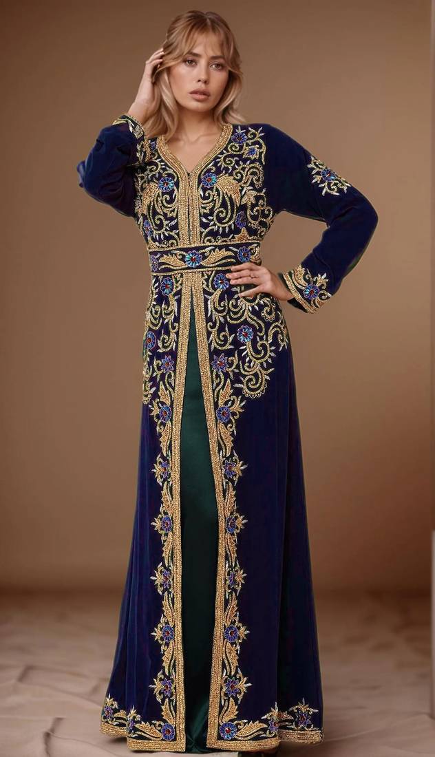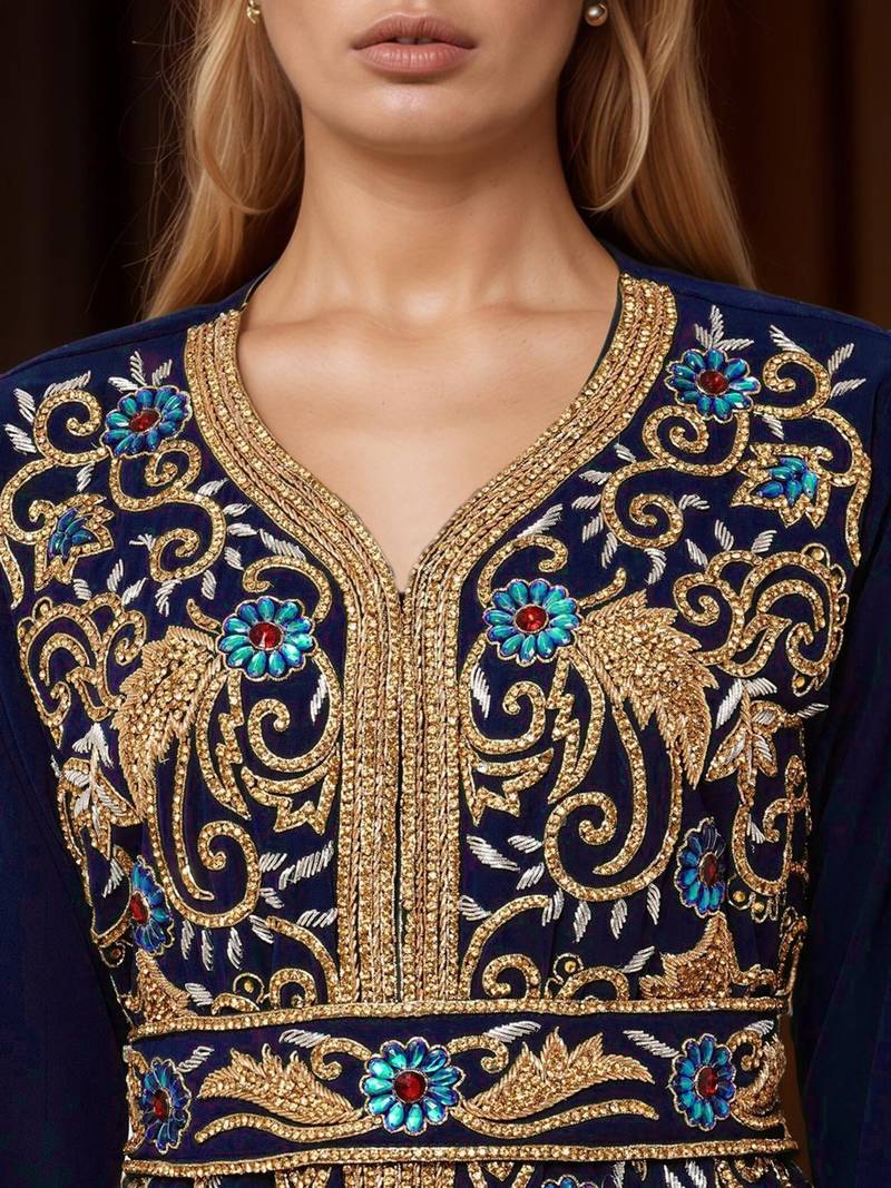 | Product Description | Luxury Navy Blue Color Full Sleeves Moroccan Kaftan, This Luxurious Design That's Sure To Turn Heads, This Kaftan Dress Flows Over Curves And Boasts An Ornate Embellished Design With Golden & Silver Beads, And Beautiful Crystal Stones. |