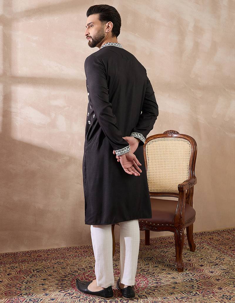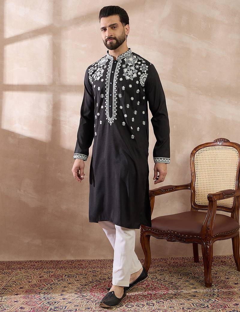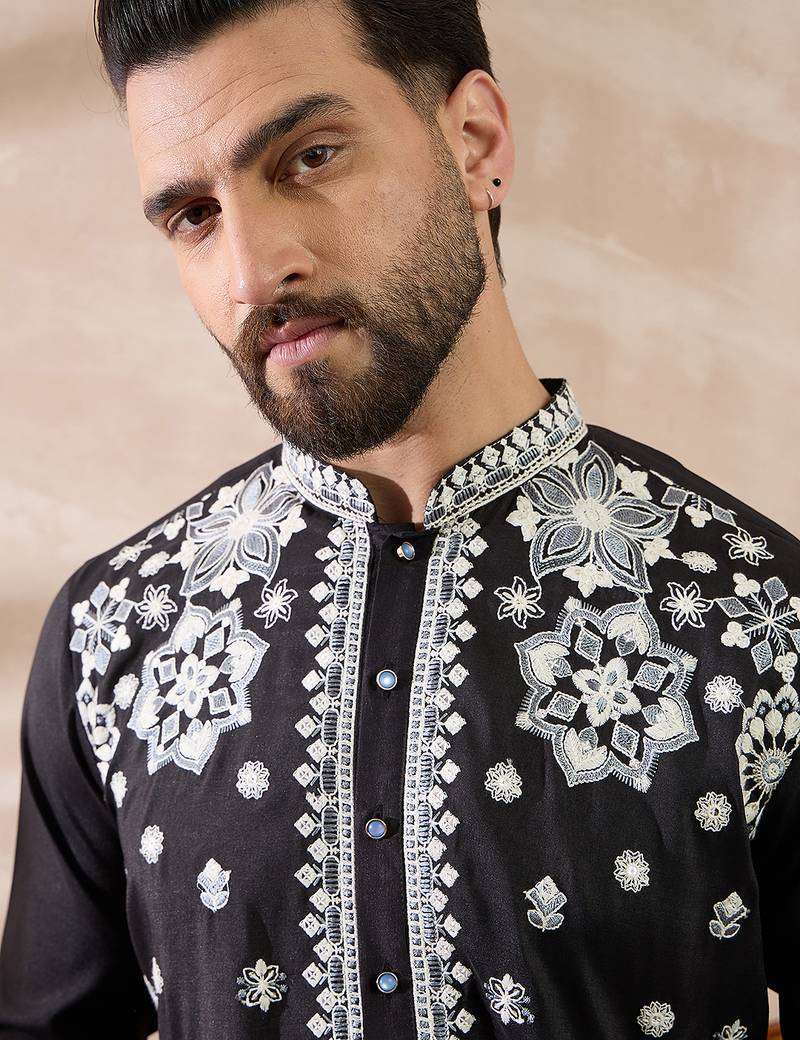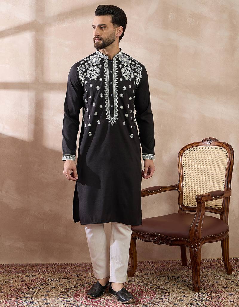 | Product Name | Men Black Silk Blend Embroidered Mandarin Collar Straight Kurta | |