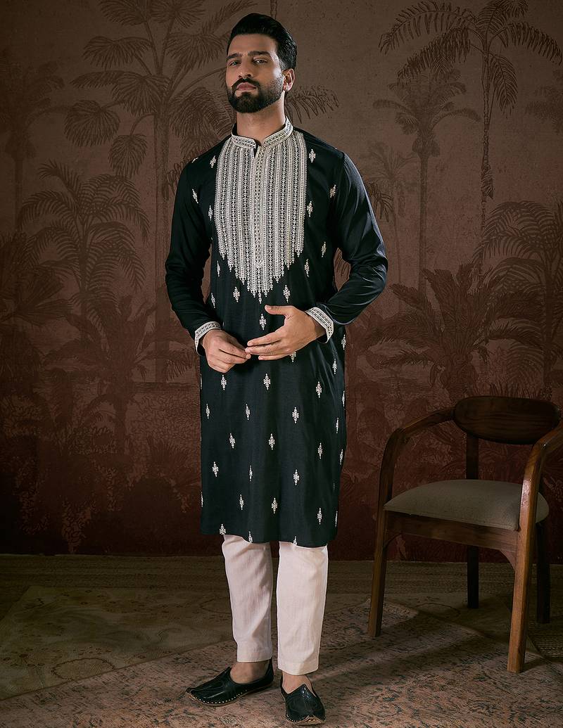 | Product Name | Men Black Silk Blend Solid Embroidered Straight Kurta | |