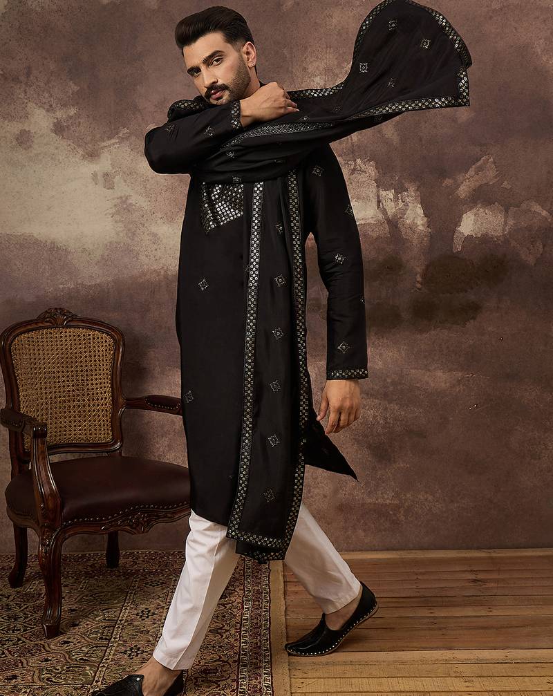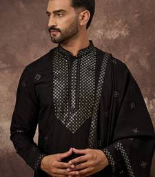 | Product Name | Men Black Silk Blend Solid Embroidered Straight Kurta With Dupatta | |