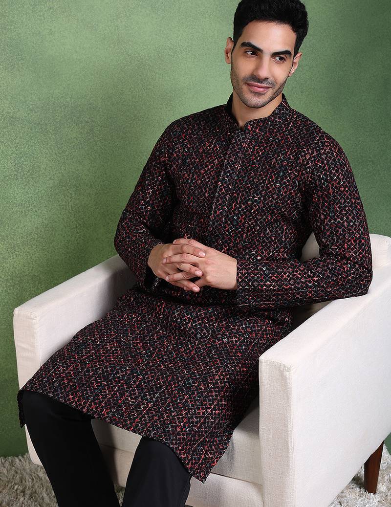 Men black viscose rayon ethnic motifs embroidered straight kurta
