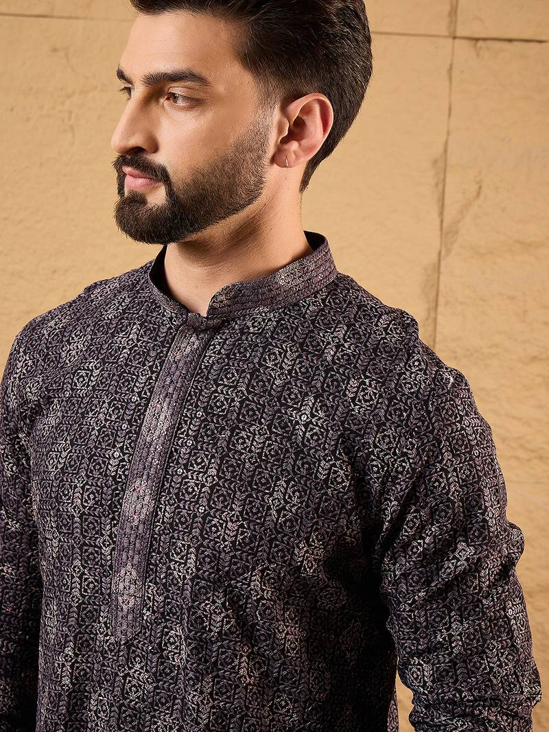 Men black viscose rayon ethnic motifs embroidered straight kurta