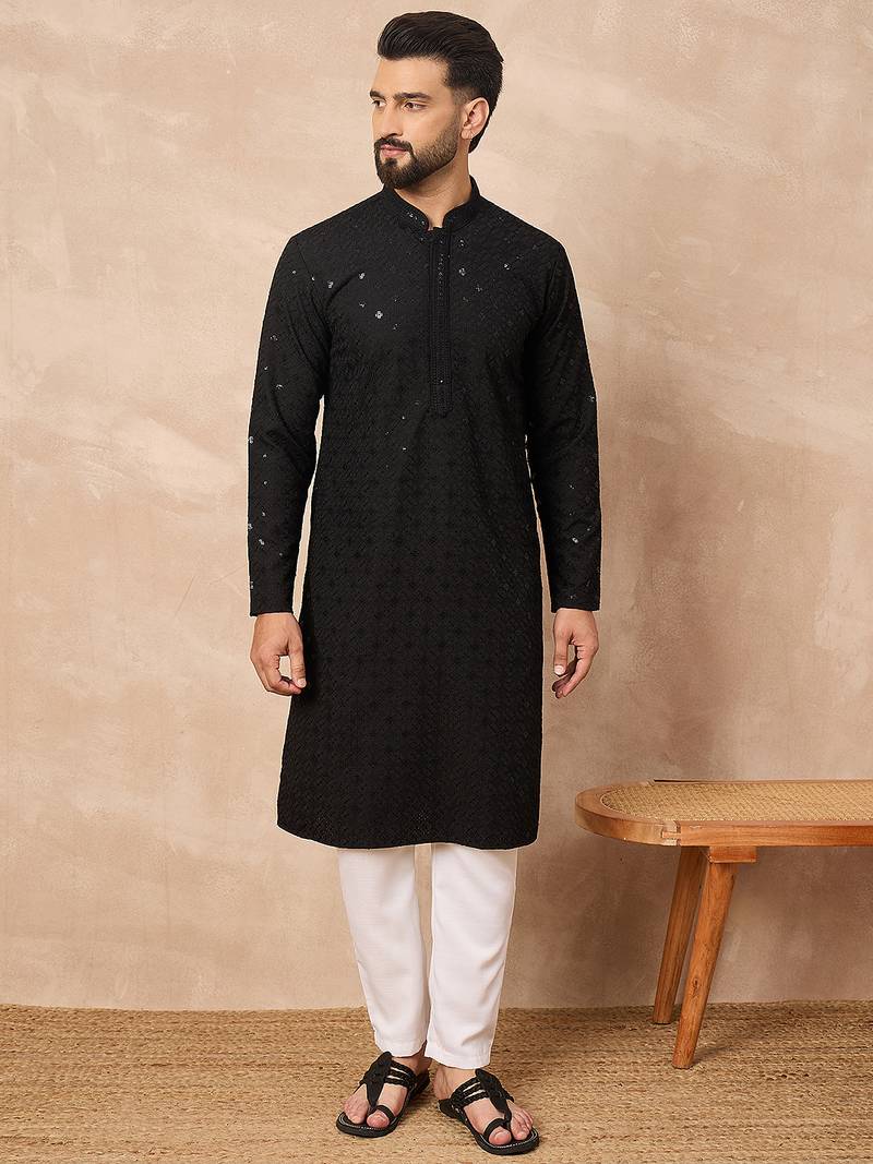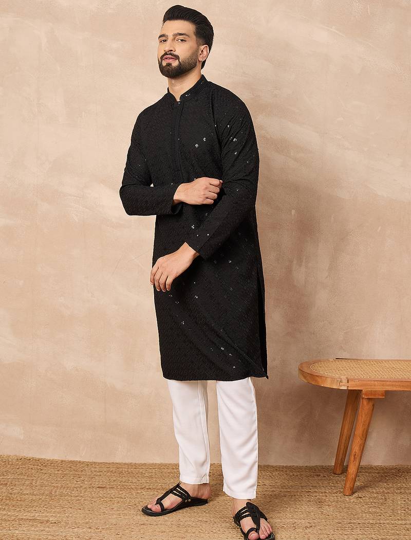 Men black viscose rayon solid embroidered straight kurta