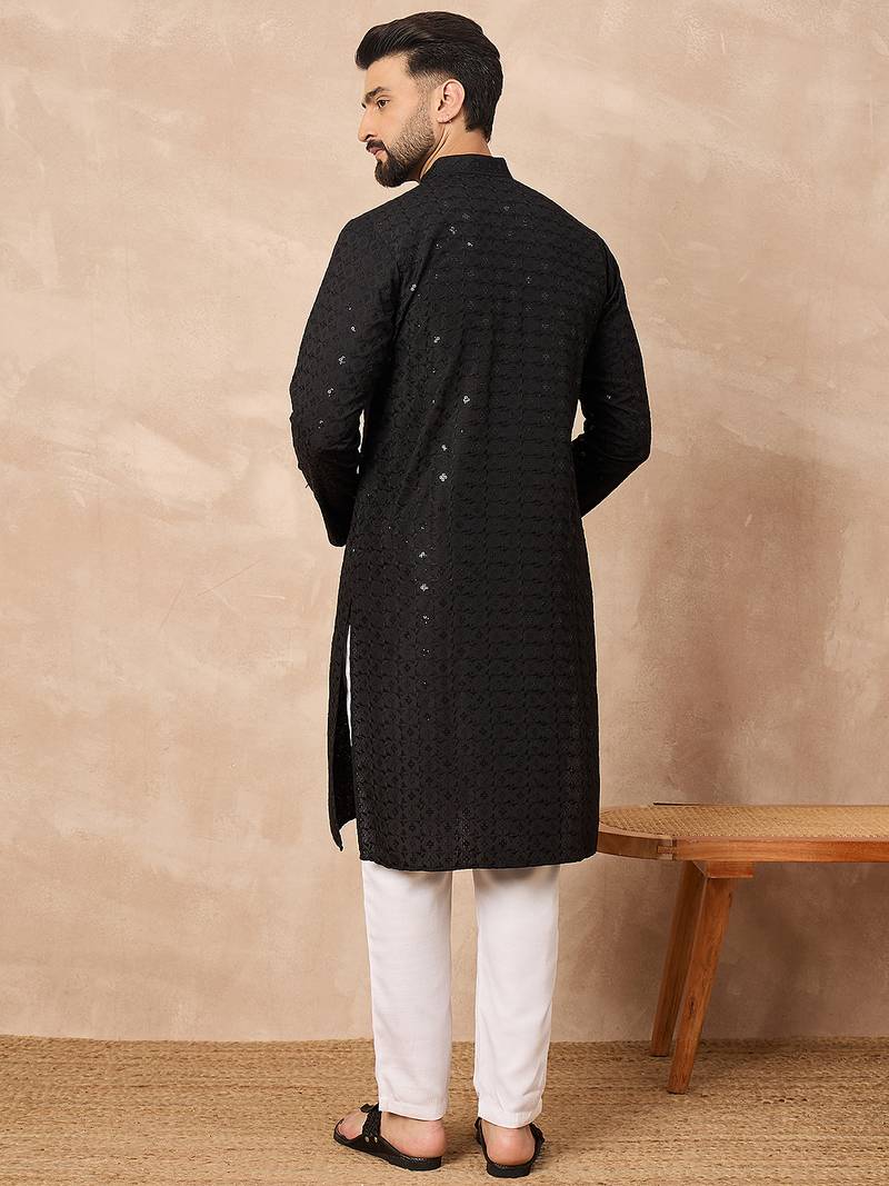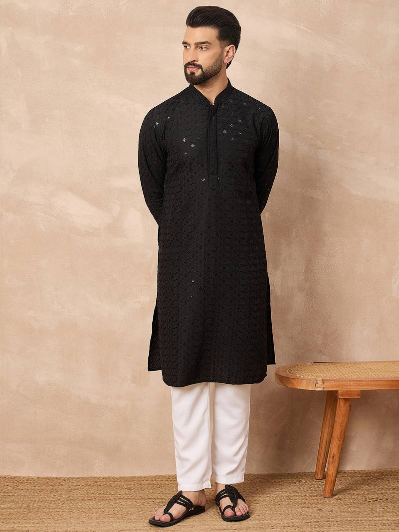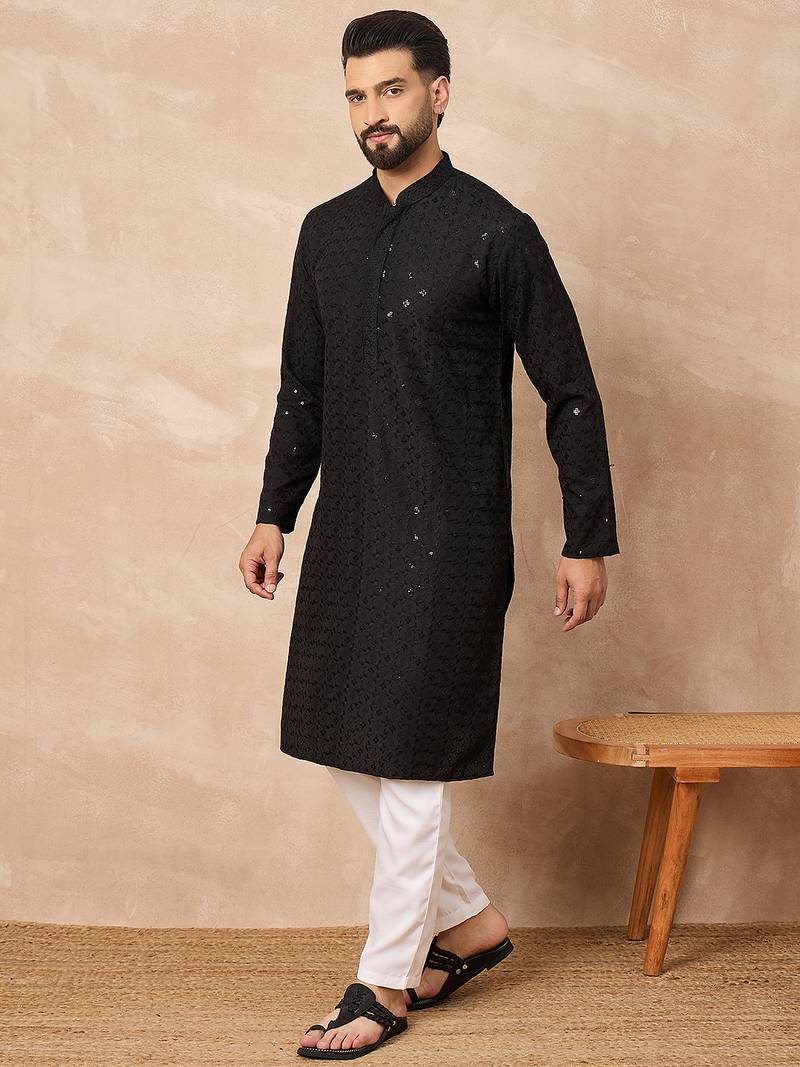 Men black viscose rayon solid embroidered straight kurta
