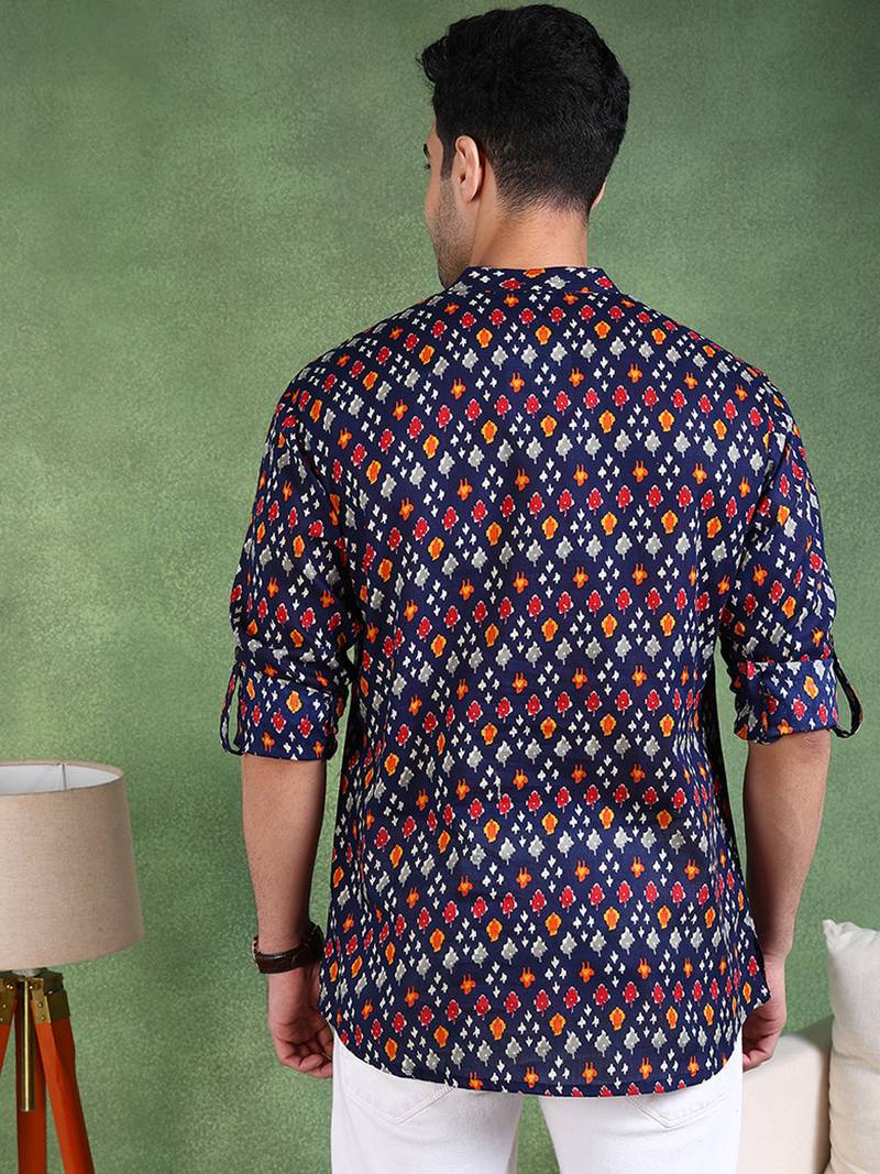 Men blue cotton geometric printed straight short kurta