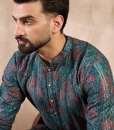 Men blue silk blend floral printed straight kurta