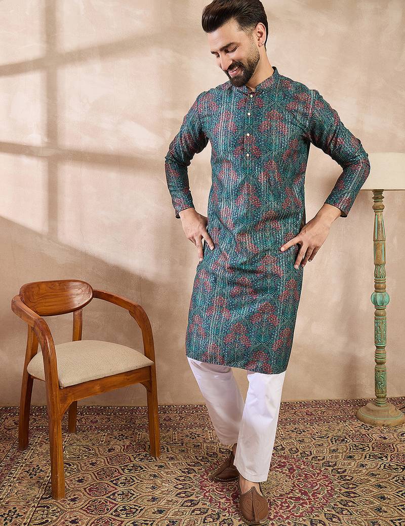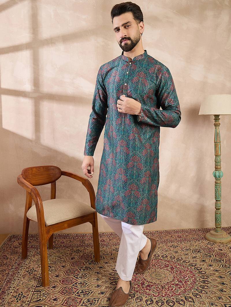 | Product Name | Men Blue Silk Blend Floral Printed Straight Kurta | |