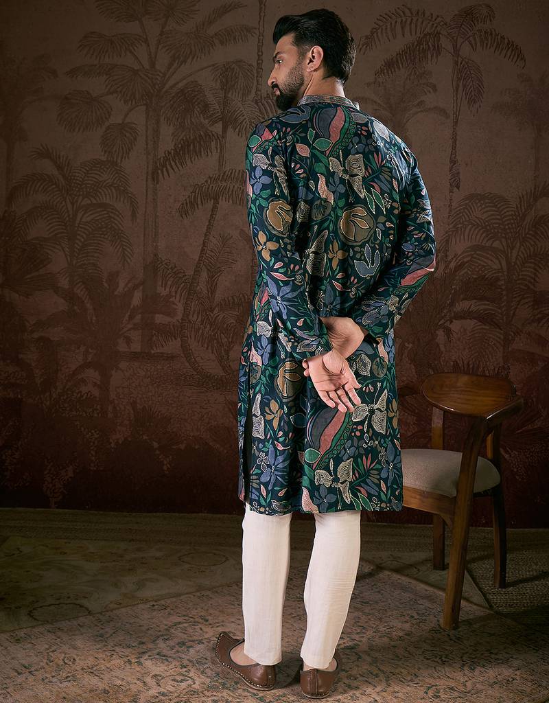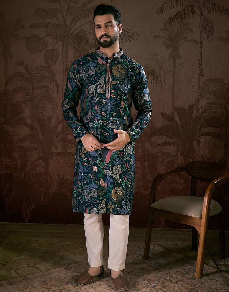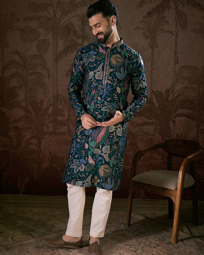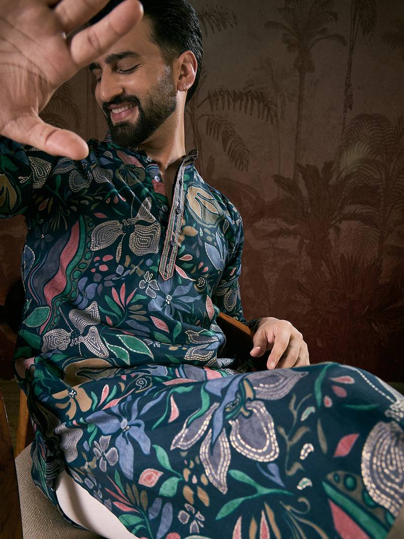 | Product Name | Men Blue Silk Blend Floral Printed Straight Kurta | |