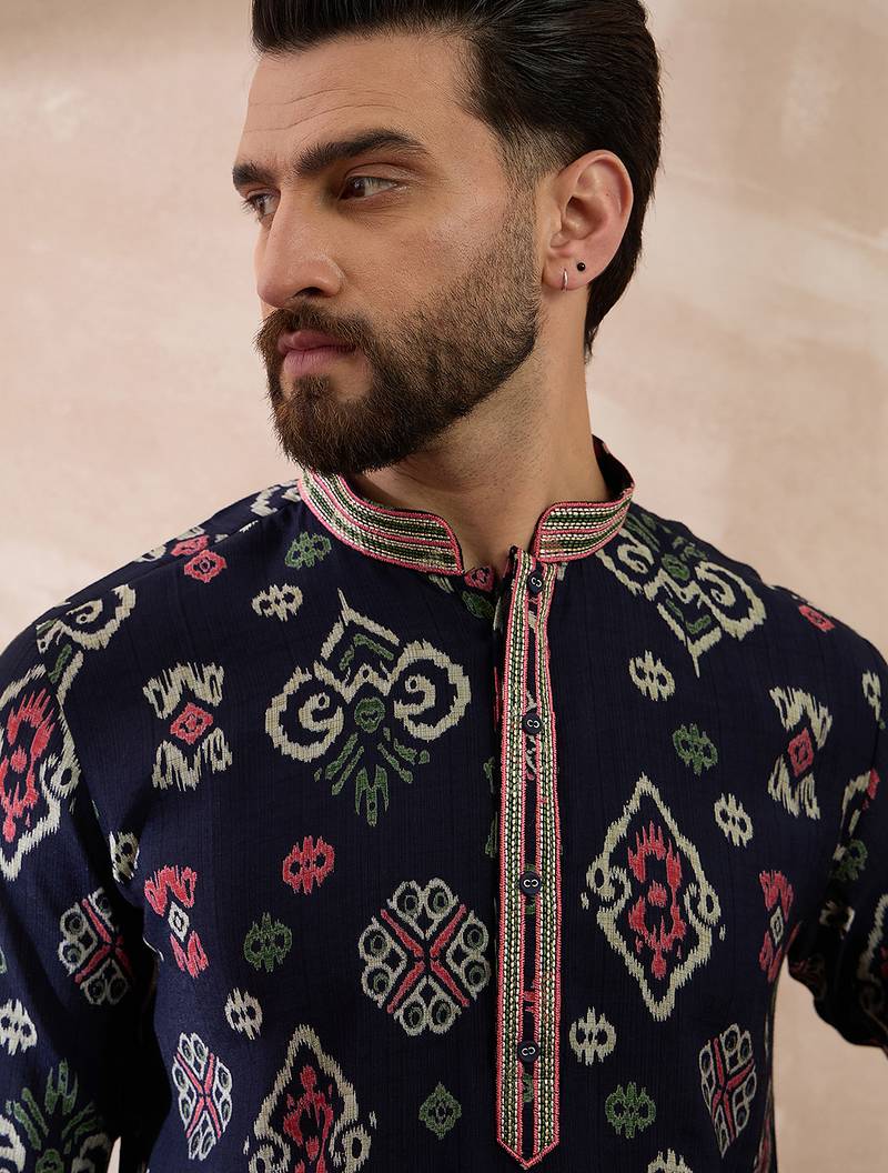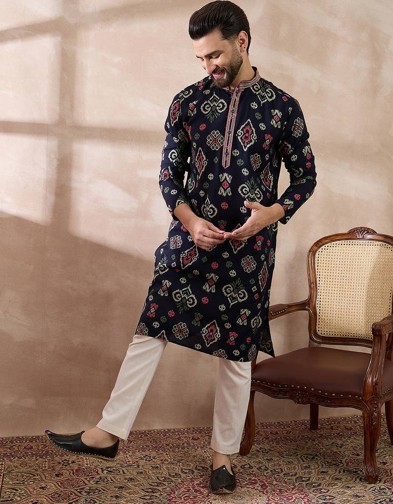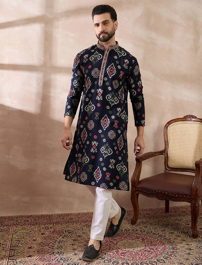 | Product Name | Men Blue Silk Blend Printed Mandarin Collar Straight Kurta With Trouser | |