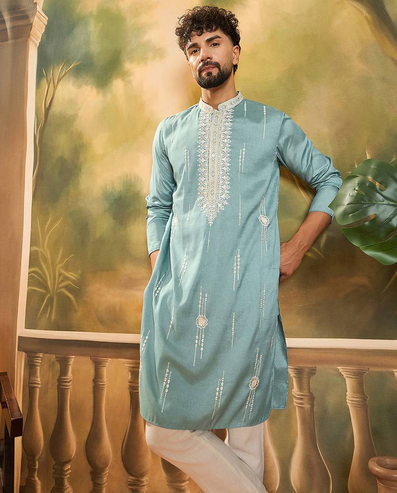 | Product Name | Men Blue Silk Blend Solid Embroidered Straight Kurta | |