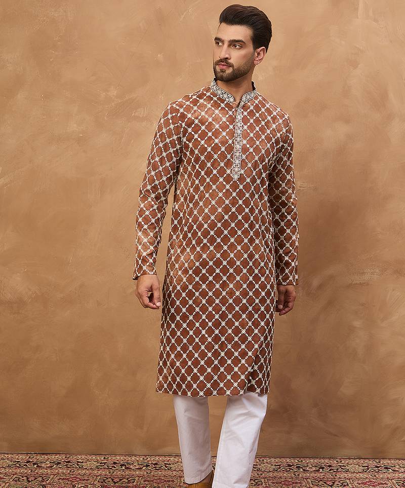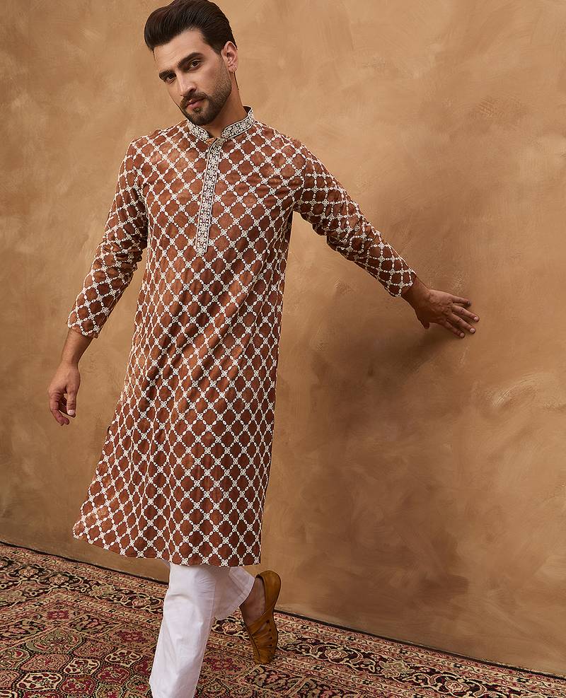 Men brown viscose rayon solid embroidered straight kurta