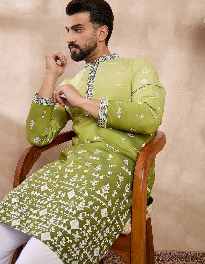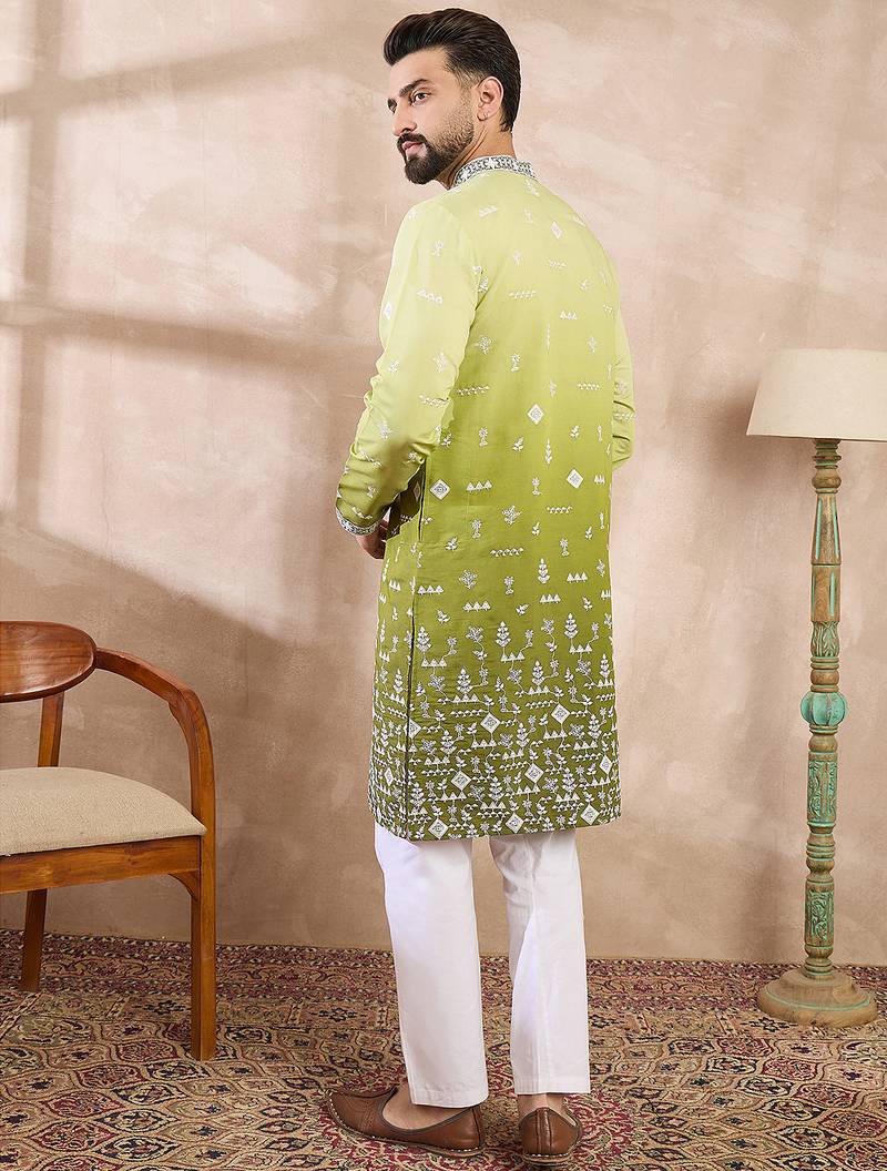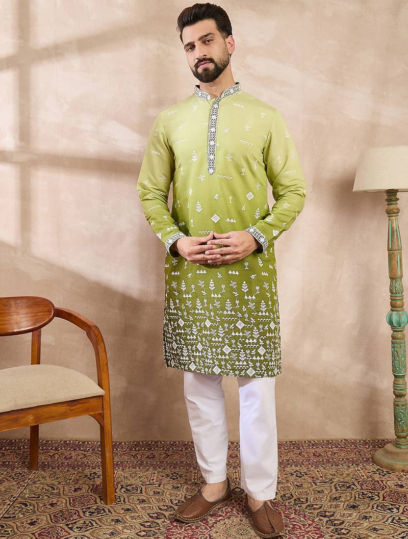 Men green silk blend ethnic motifs embroidered straight kurta