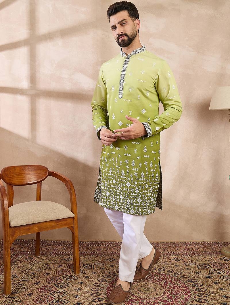 | Product Name | Men Green Silk Blend Ethnic Motifs Embroidered Straight Kurta | |