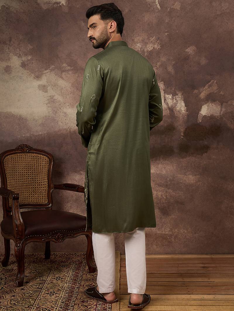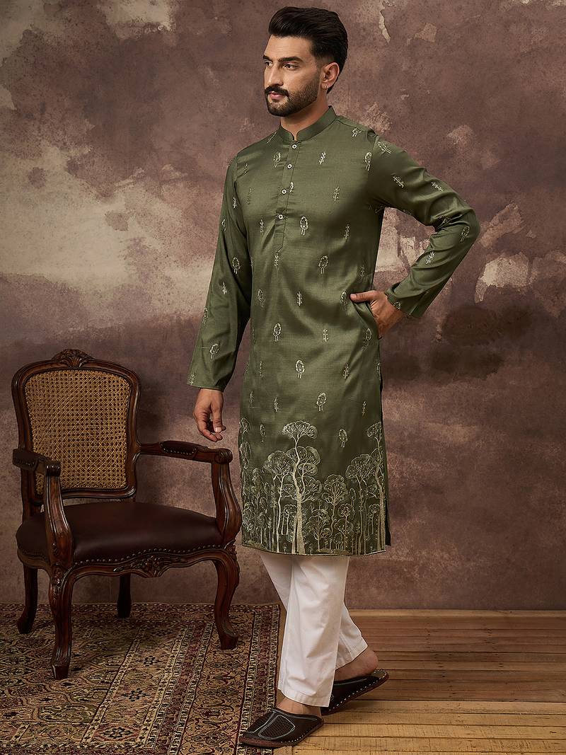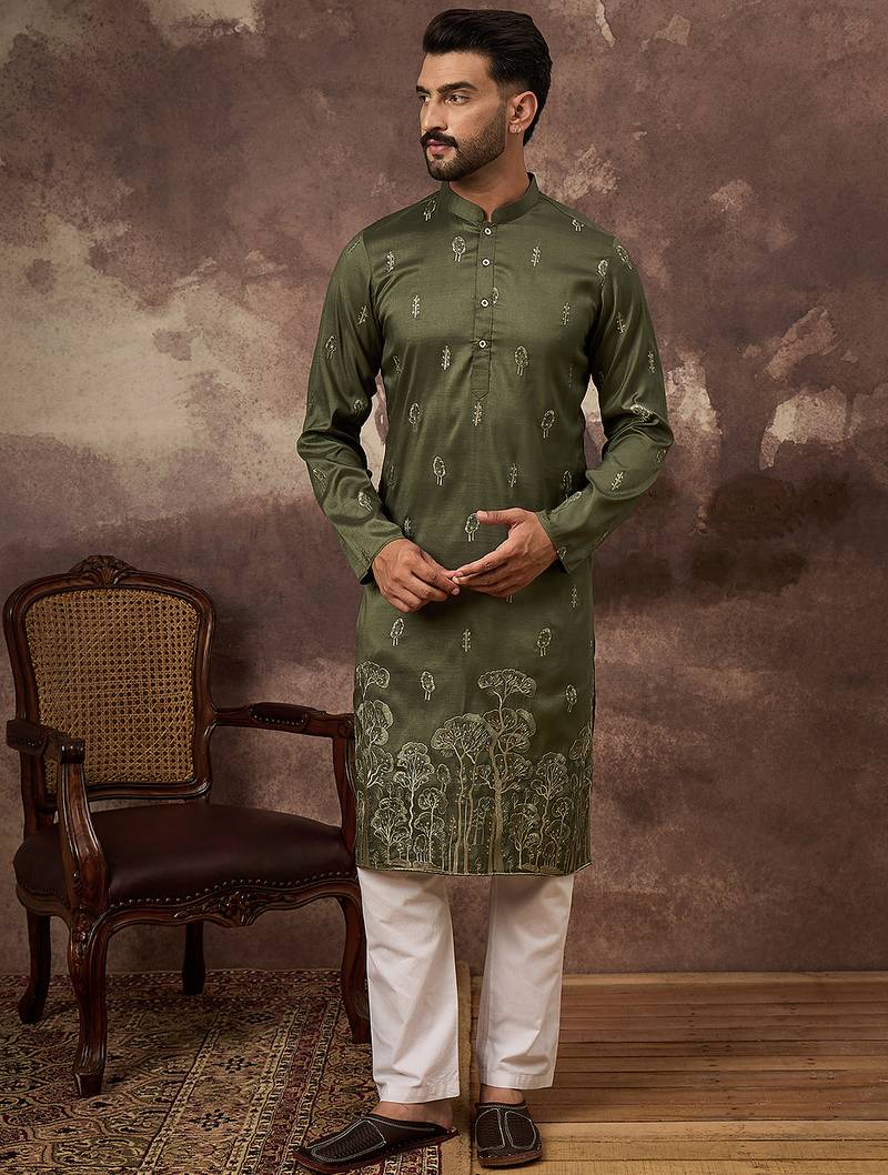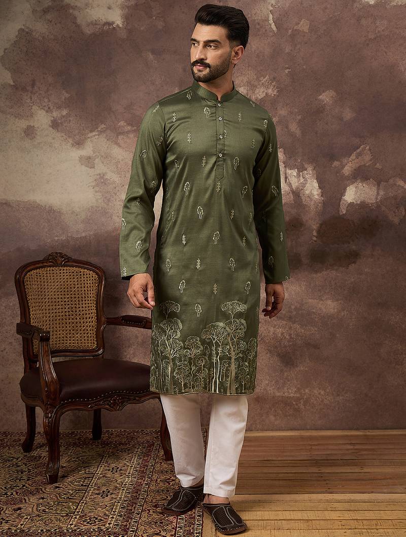 | Product Name | Men Green Silk Blend Solid Embroidered Straight Kurta | |
