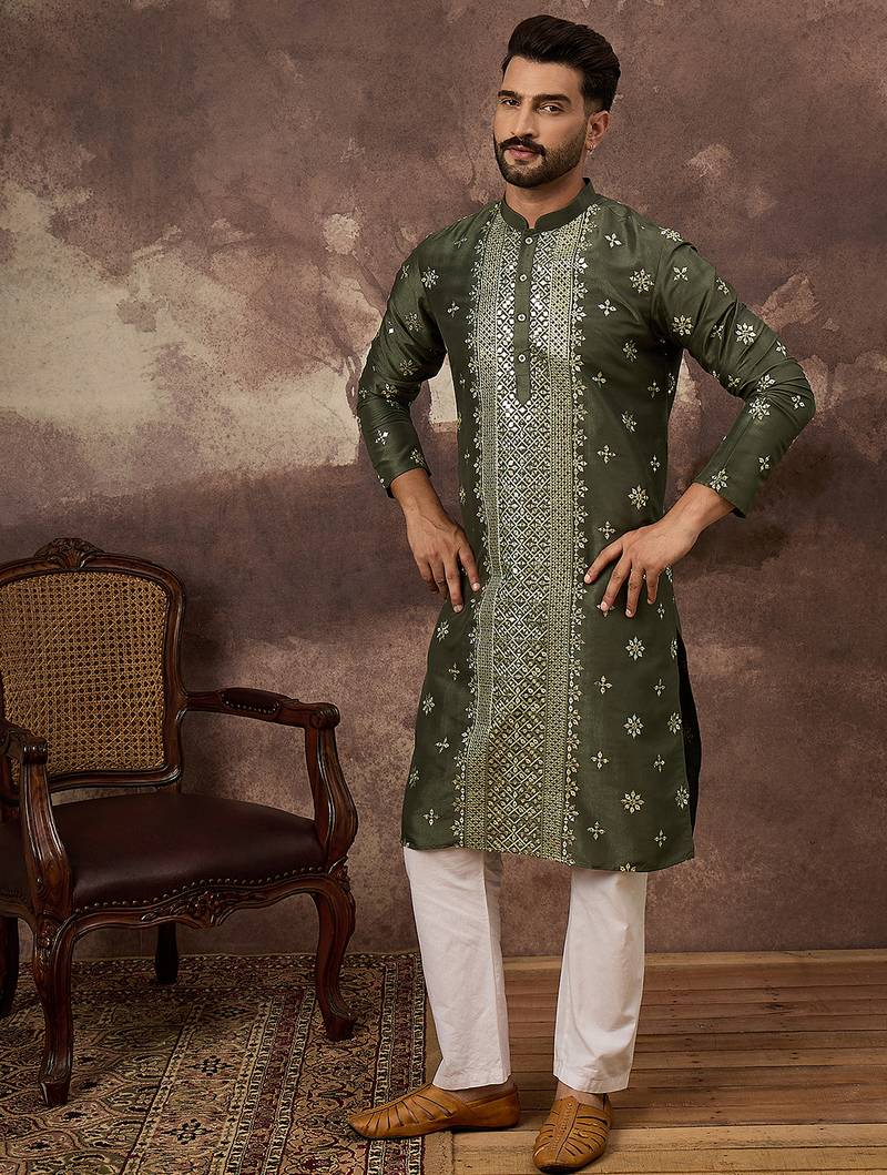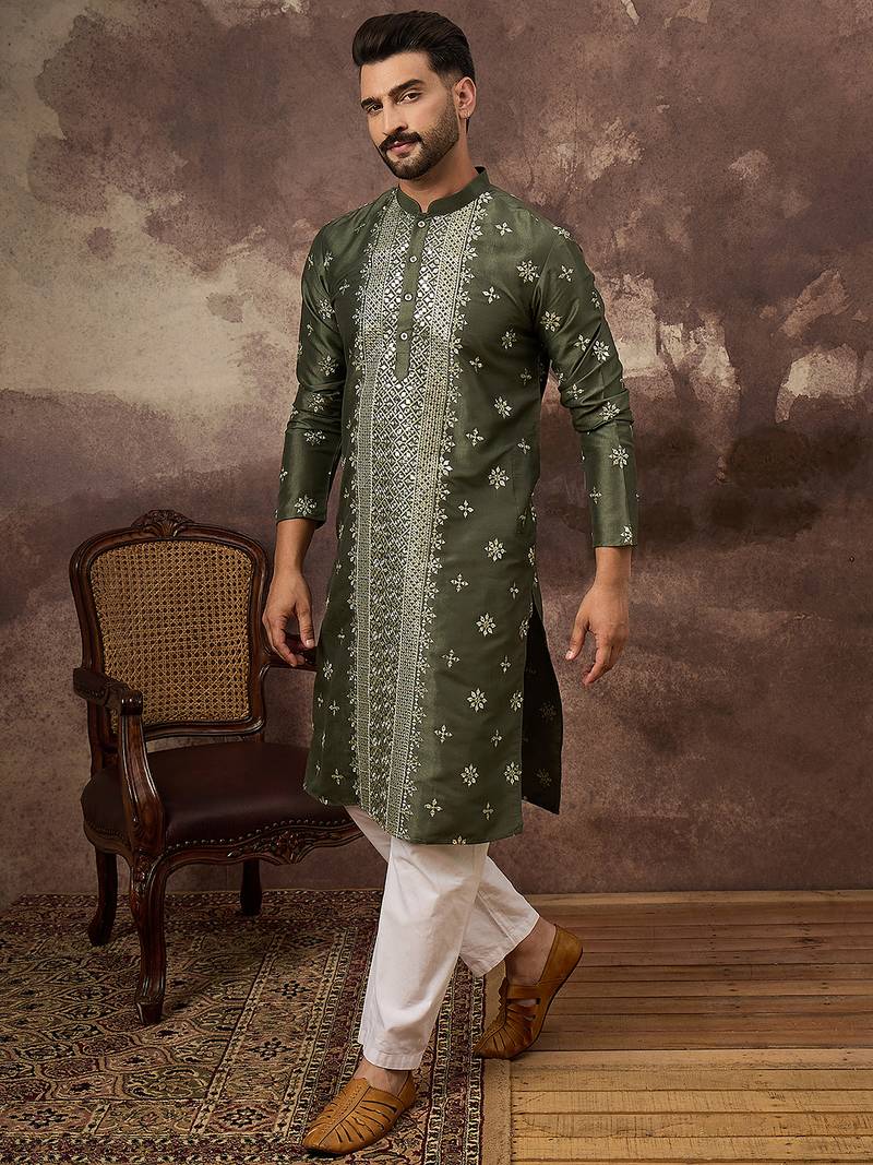 | Product Name | Men Green Silk Blend Solid Embroidered Straight Kurta | |